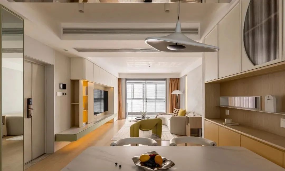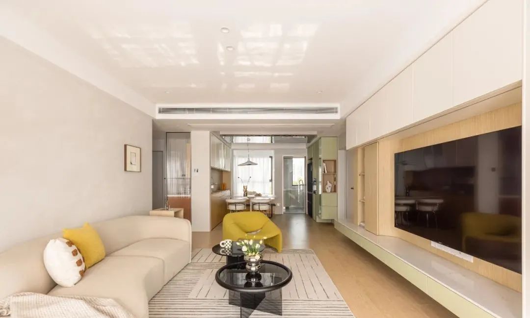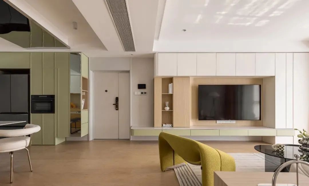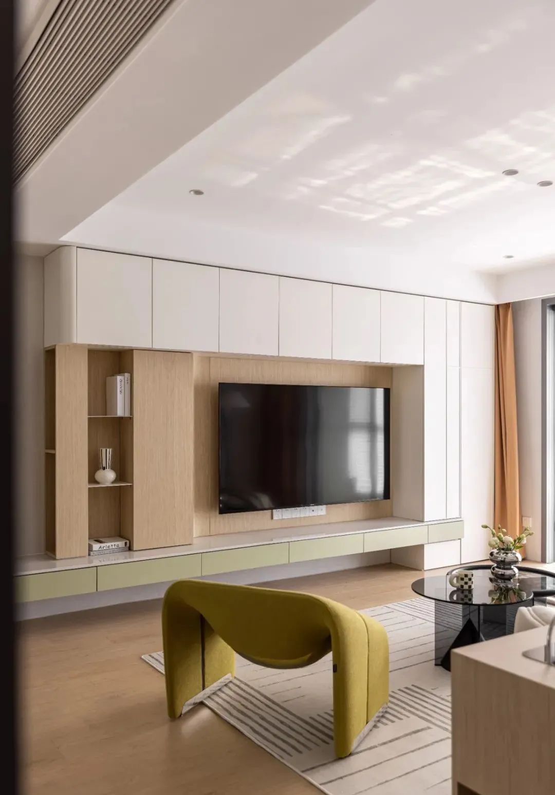 线条简洁的现代空间中大面积运用暖白与原木,搭配浅草绿,趣味黄等色系,达到温馨且有格调的居家氛围。