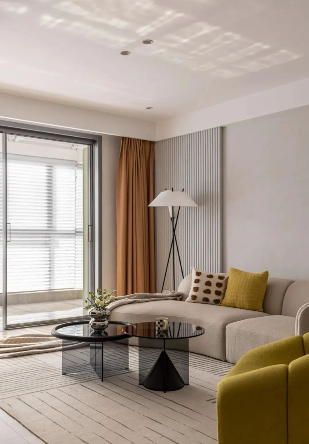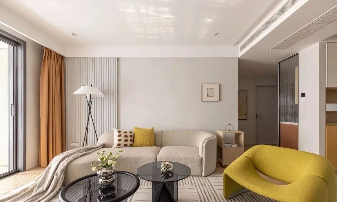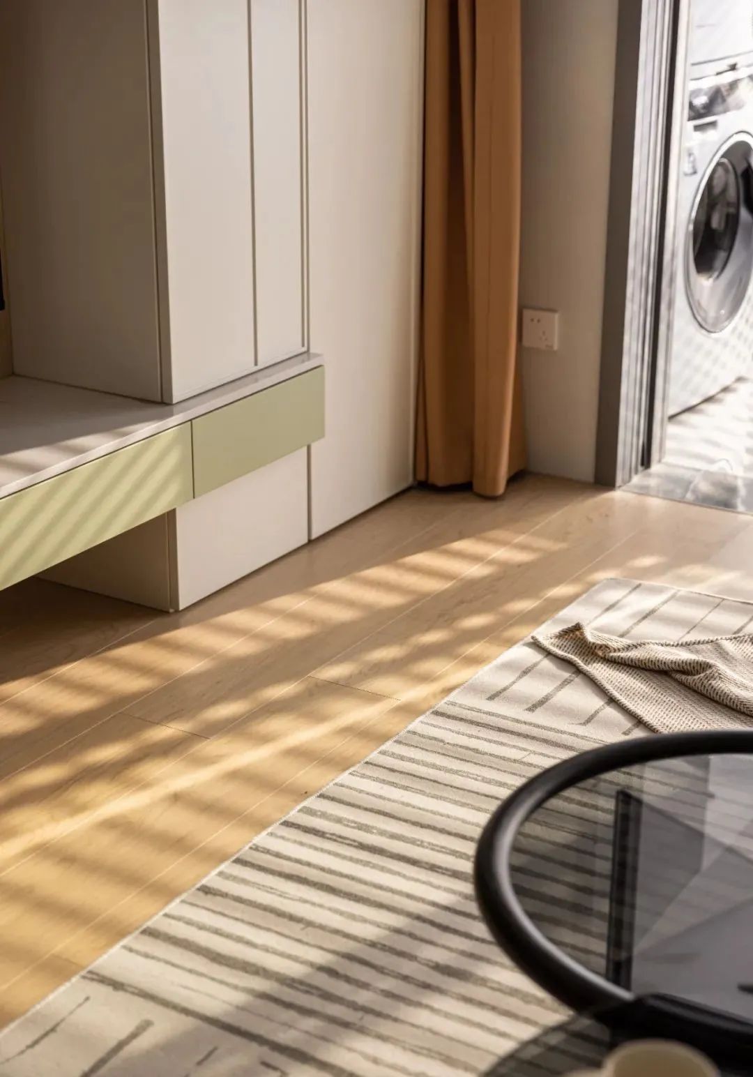 线条简洁的现代空间中大面积运用暖白与原木,搭配浅草绿,趣味黄等色系,达到温馨且有格调的居家氛围。