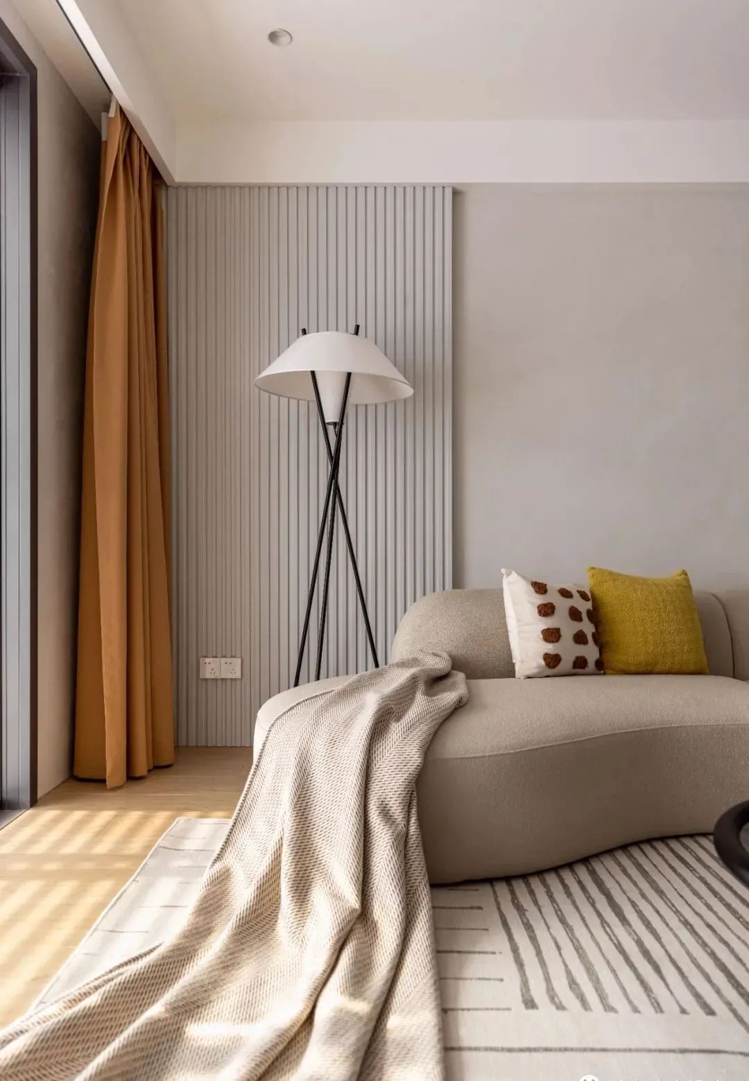 客厅以自然感的暖灰系涂料墙面为基调配以同色系的栅格板装饰过渡,表达了业主在舒适居住空间中追求一丝理性思考的生活态度。