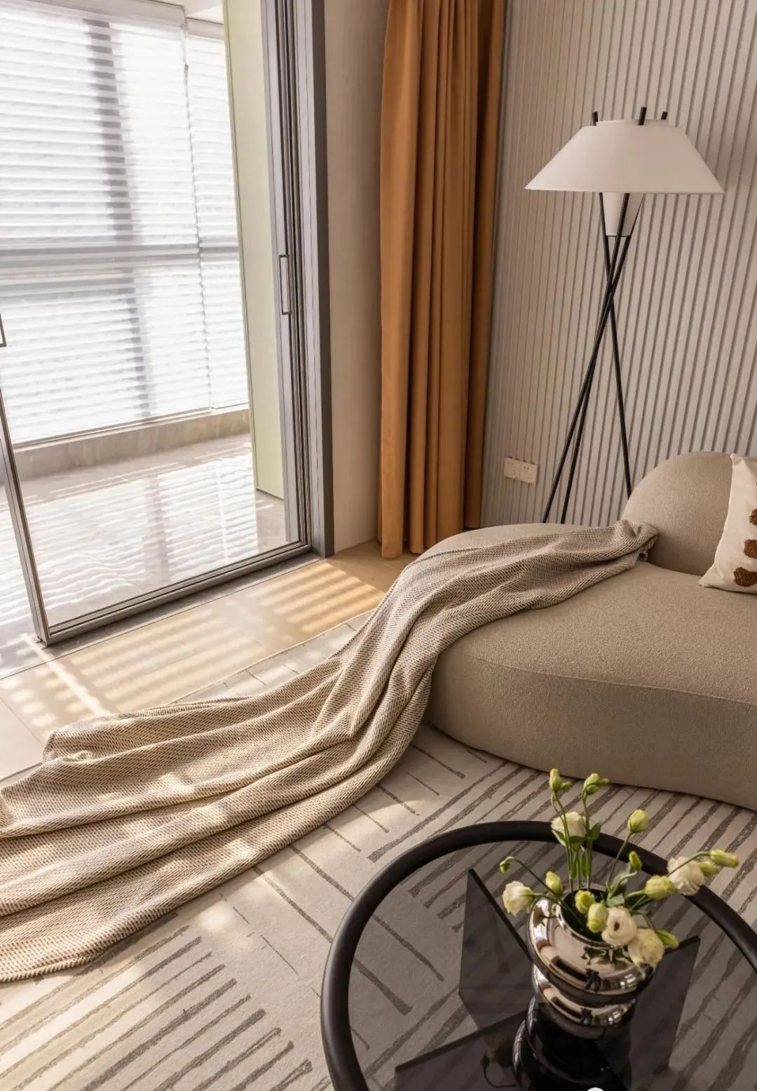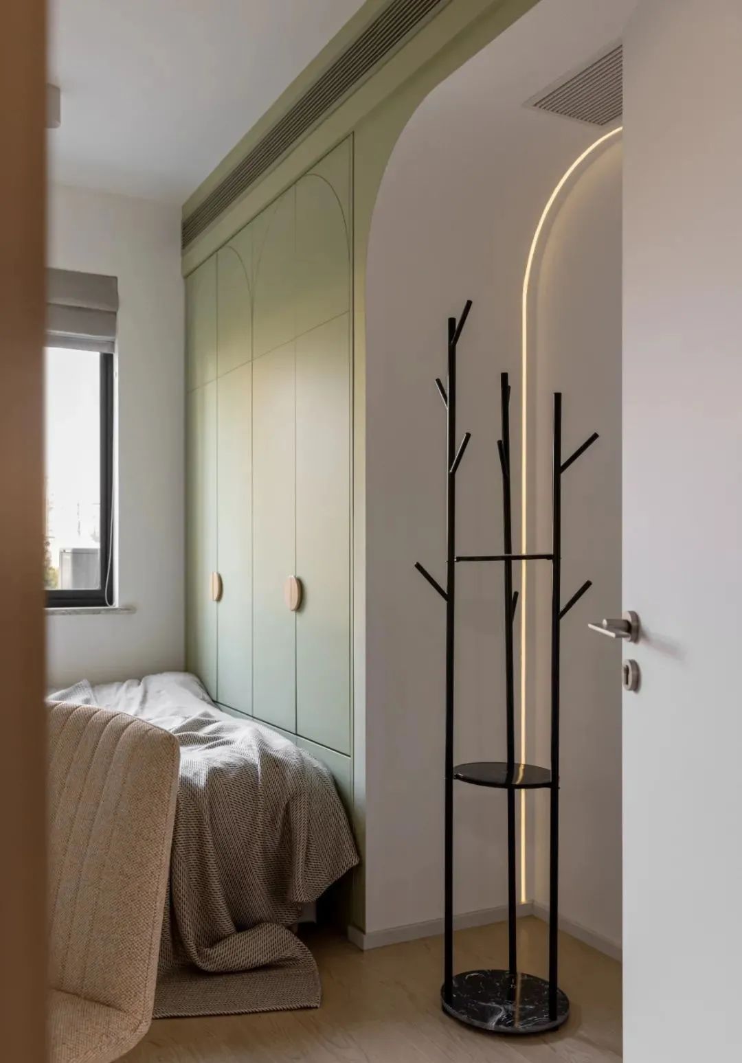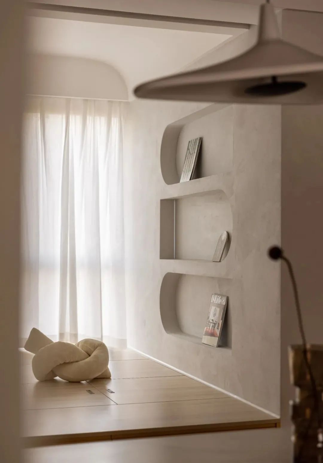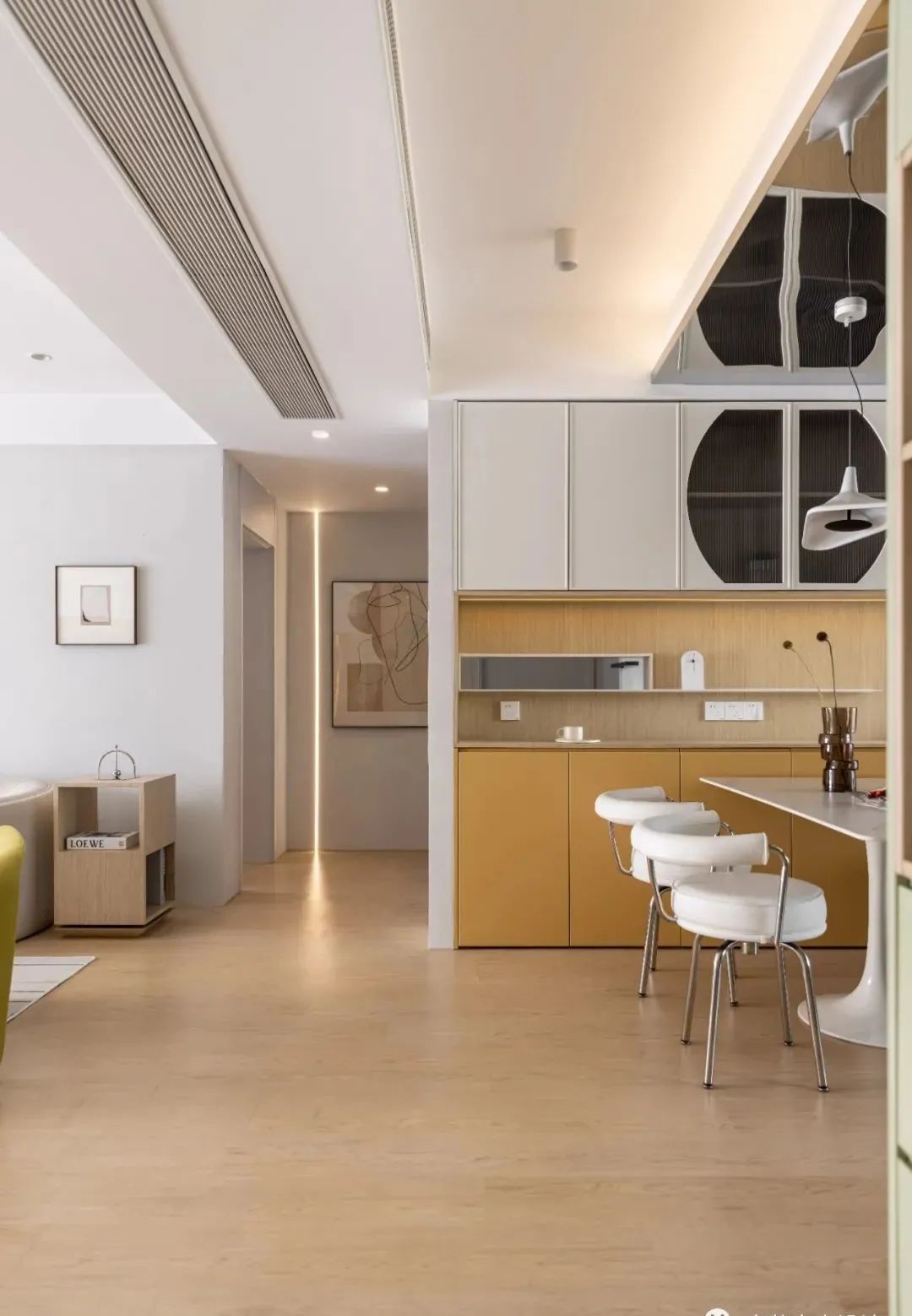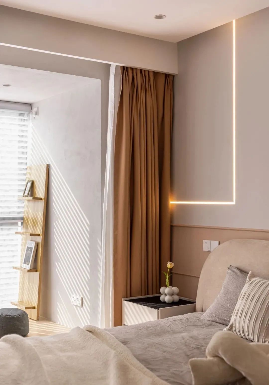 整体采用无主灯设计,踢脚线也被艺术涂料代替,空间自上而下流畅一体,营造统一序列感,扩大空间视觉。