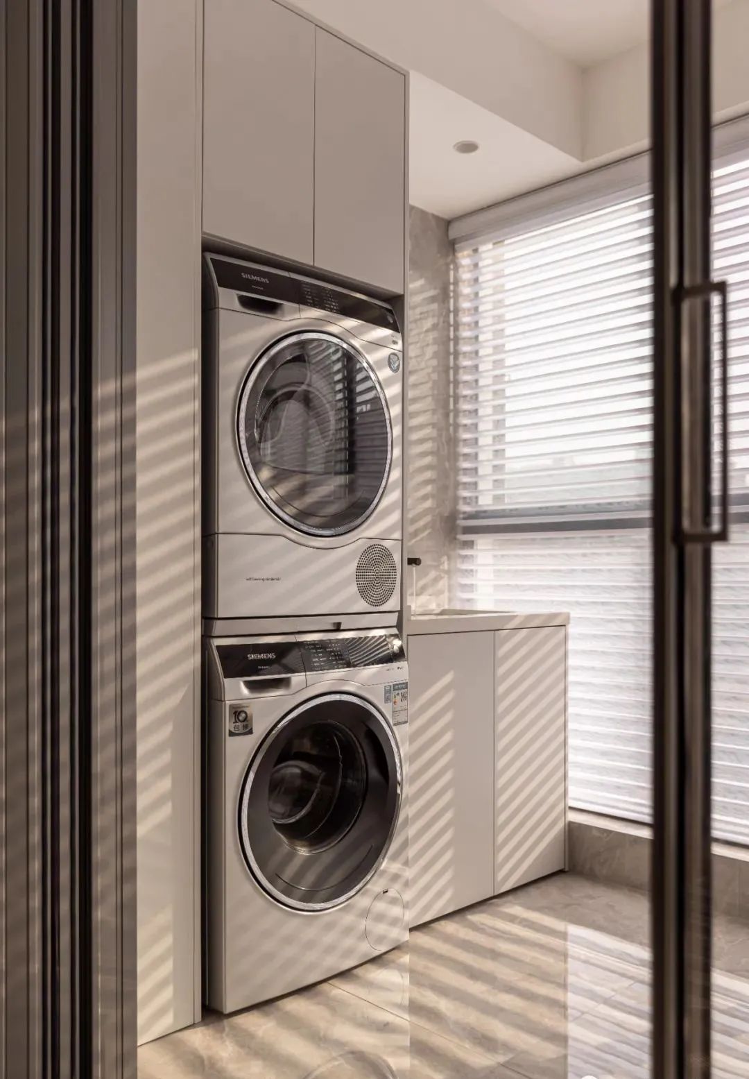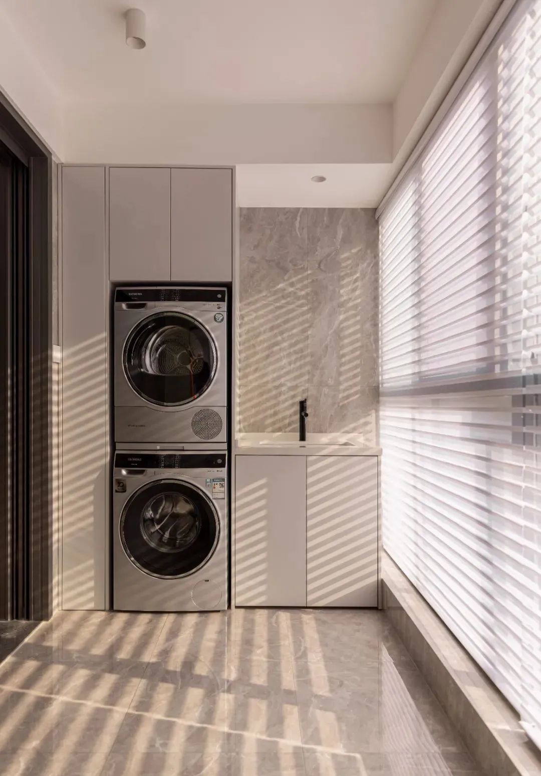 封闭式阳台通铺灰色系石纹大砖,简洁大气,同色系收纳柜搭配相得益彰。