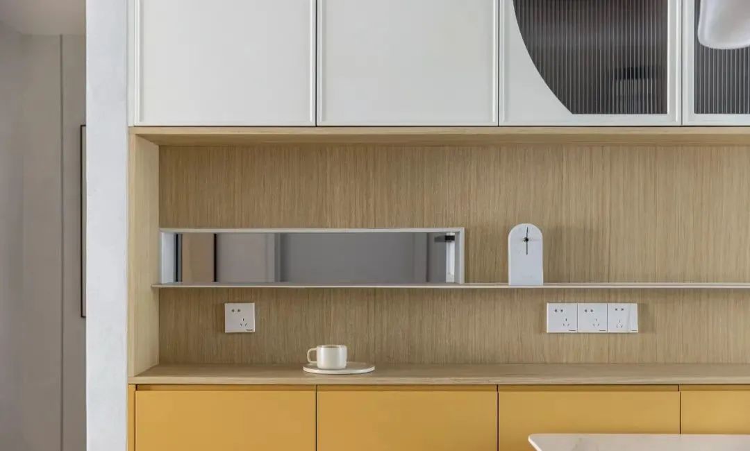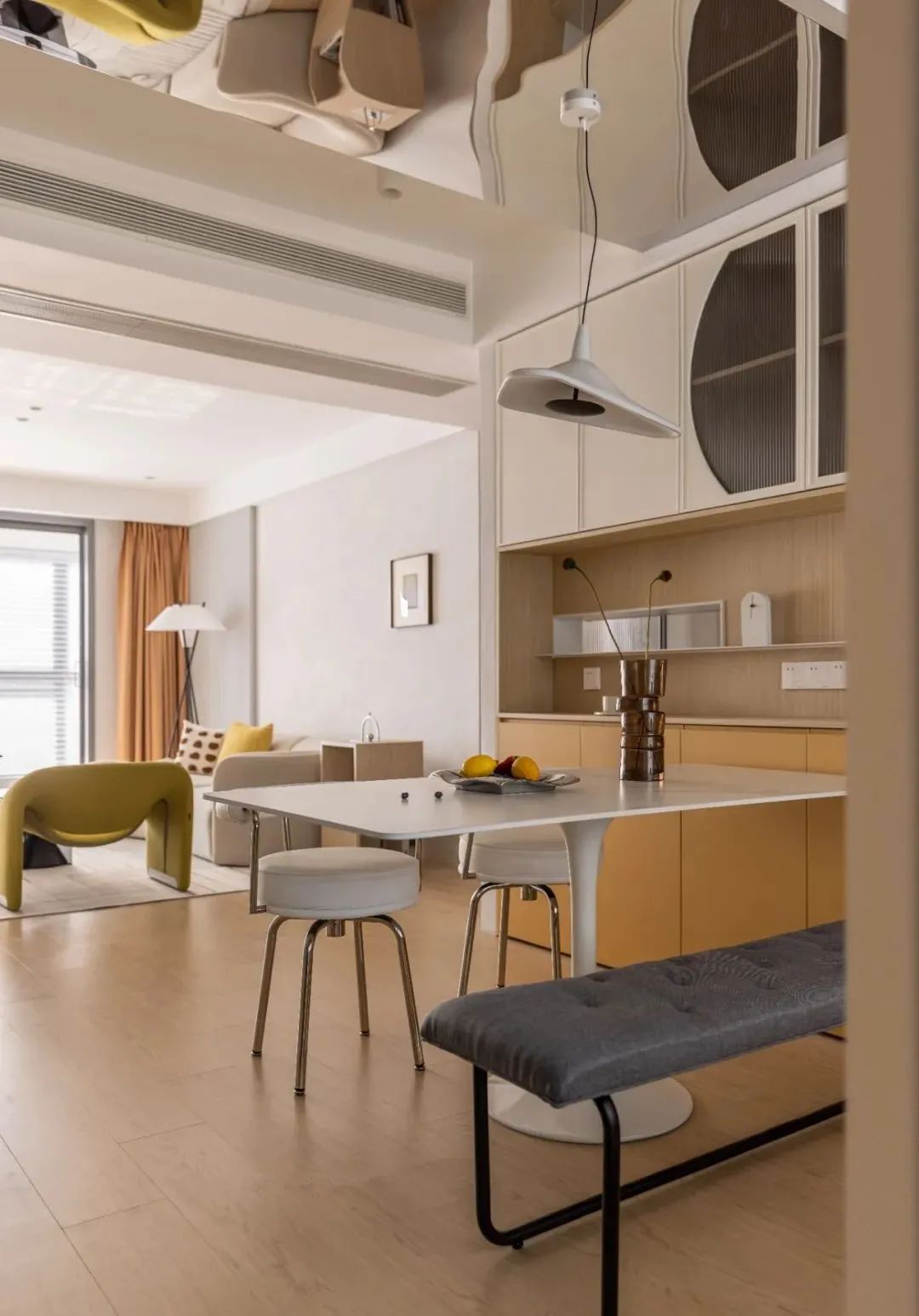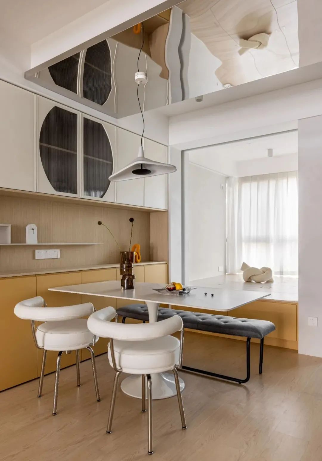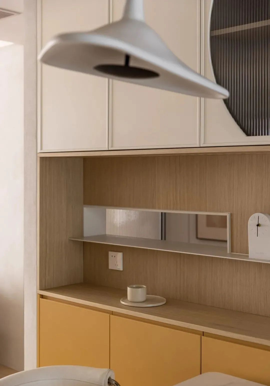 餐边柜分色处理,上部的白色满柜,在视觉上缓解过度饱和的压抑感。