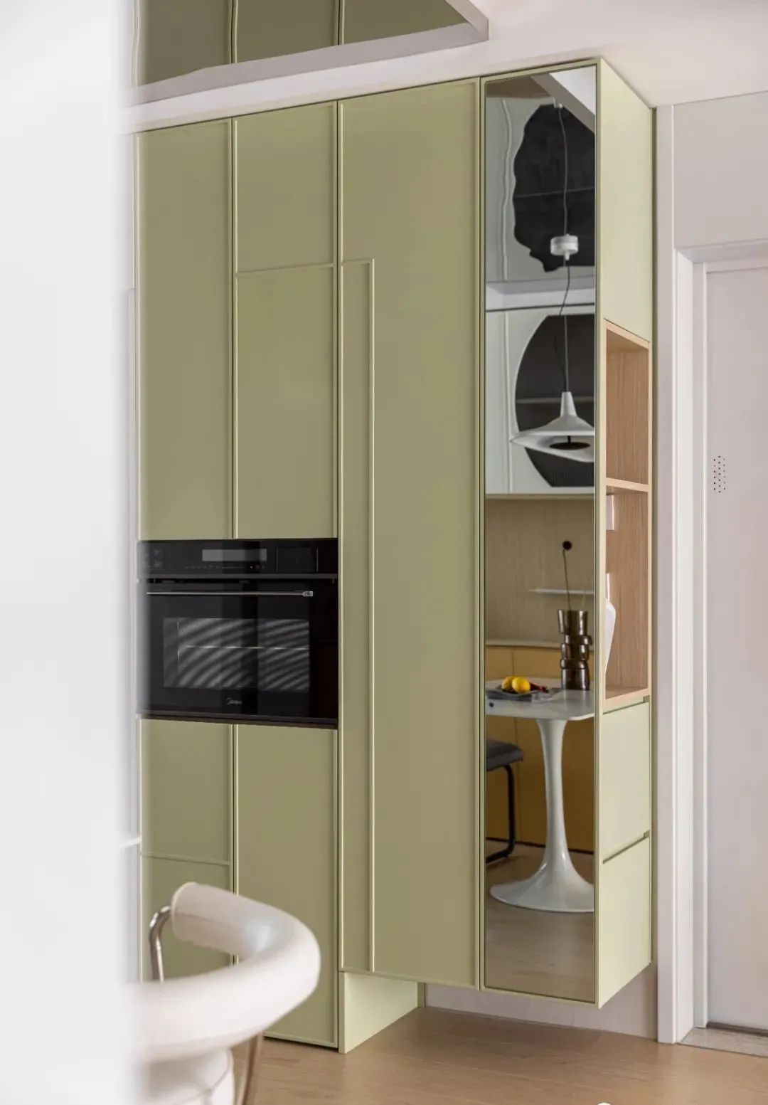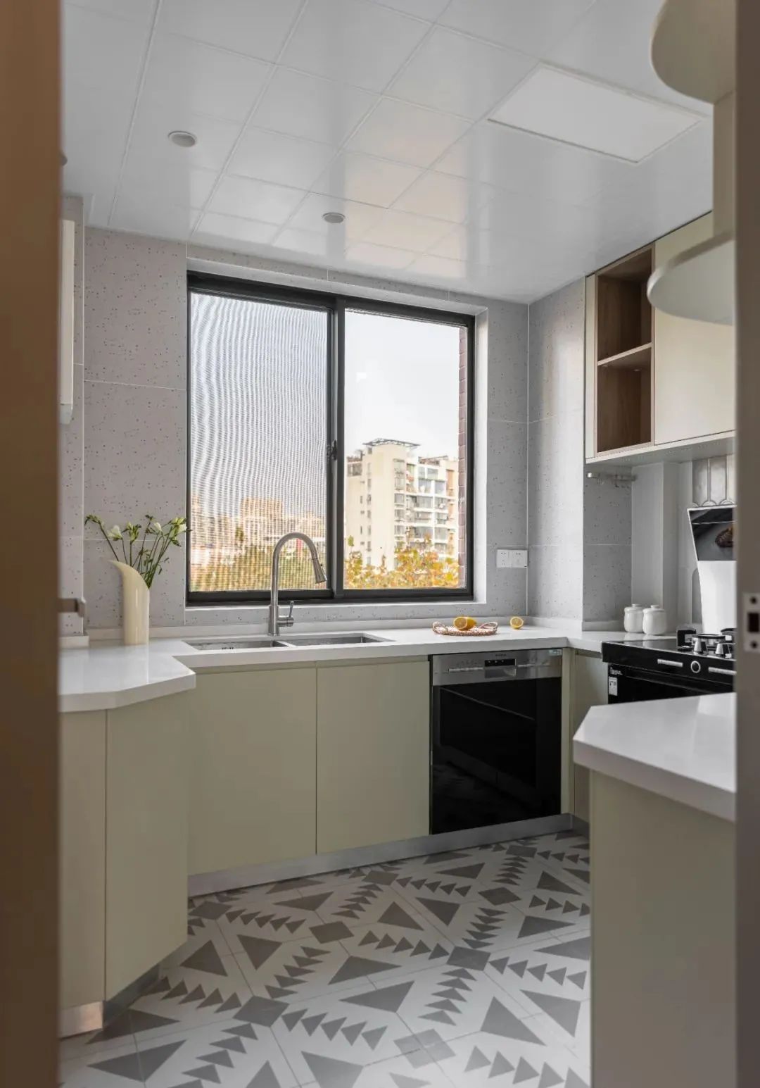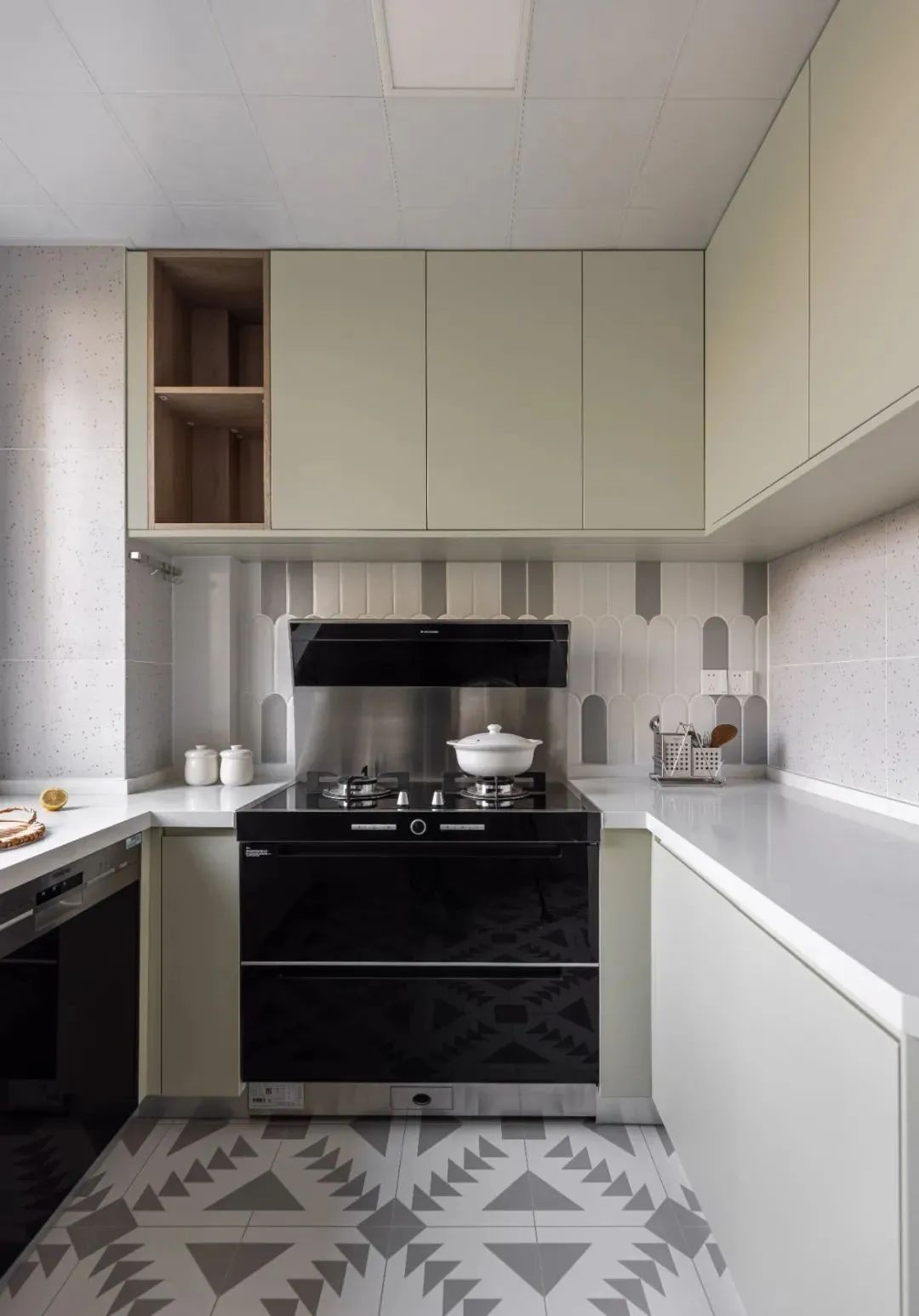 低饱和的豆沙绿柜门结合水磨石砖与花砖的混合搭配,让不大的厨房空间温馨感十足。