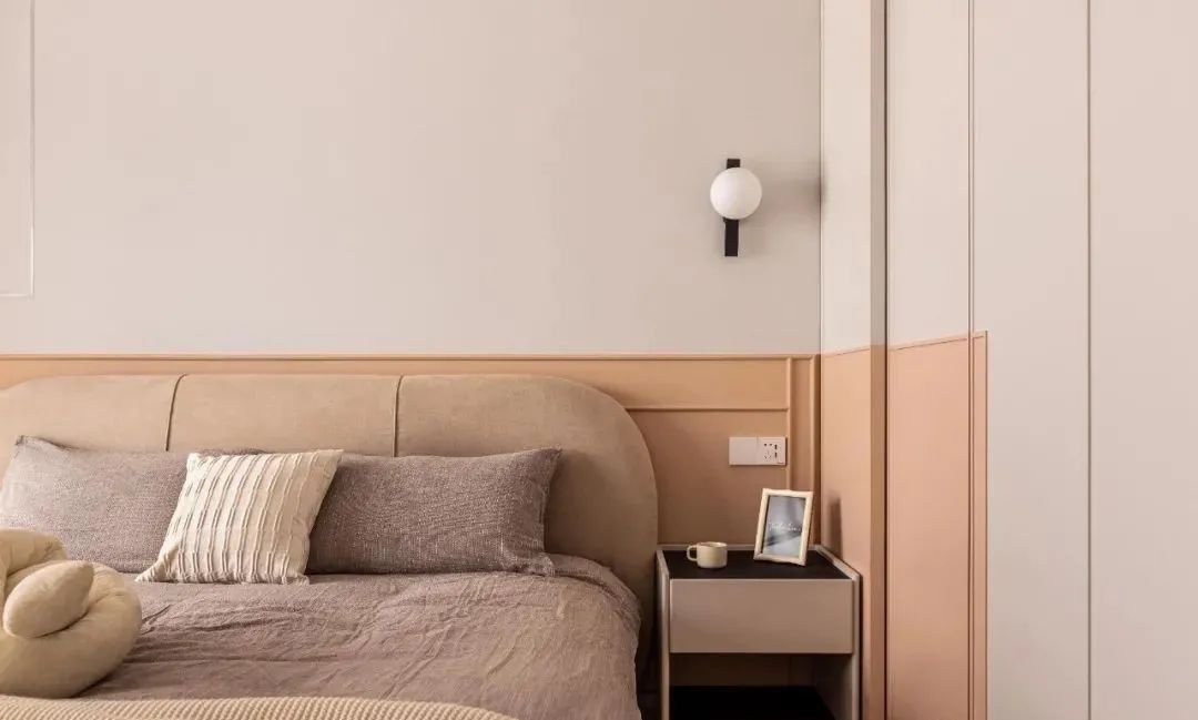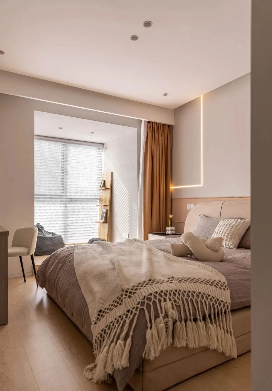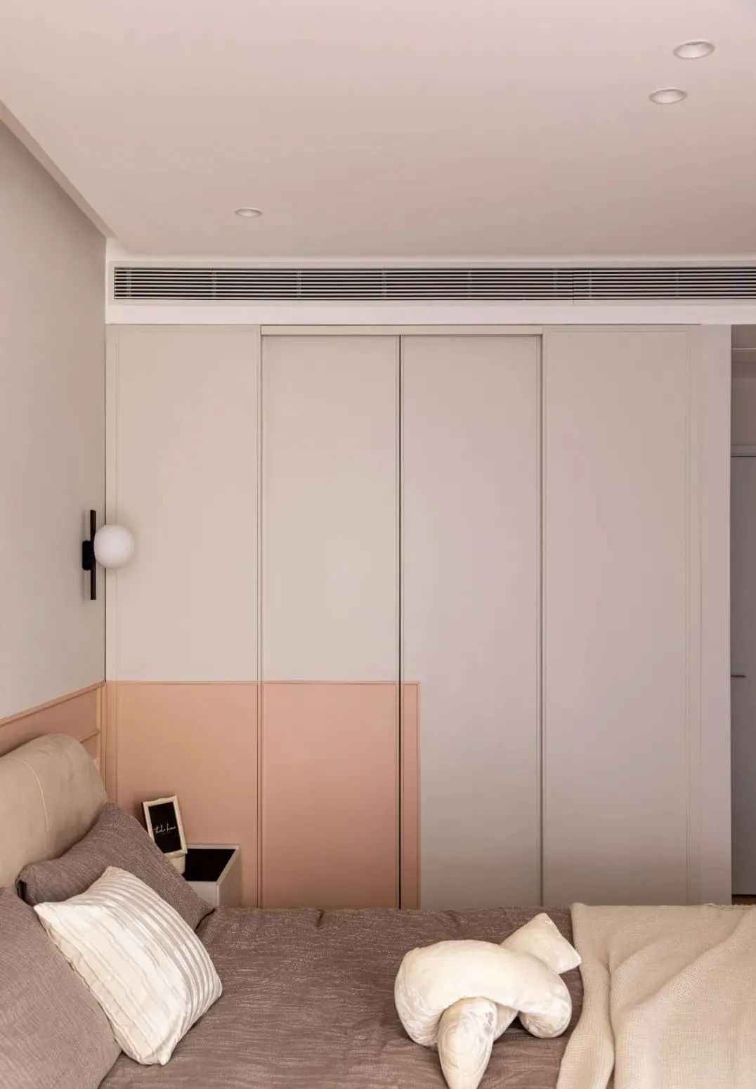 主卧采用暖灰和粉橙色碰撞,层次更丰富。利落的线性灯与简约的石膏线条通过纵横交错的重叠手法进行演绎,提升格调展现气质的同时在视觉上形成错位感。
