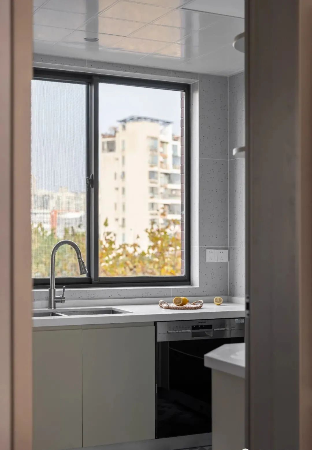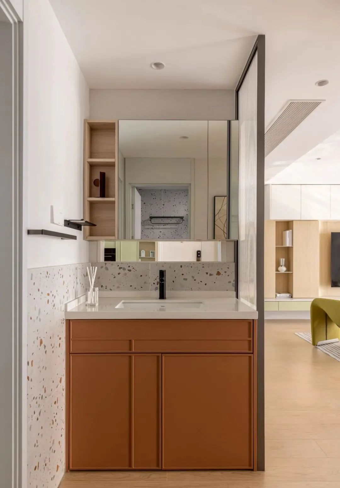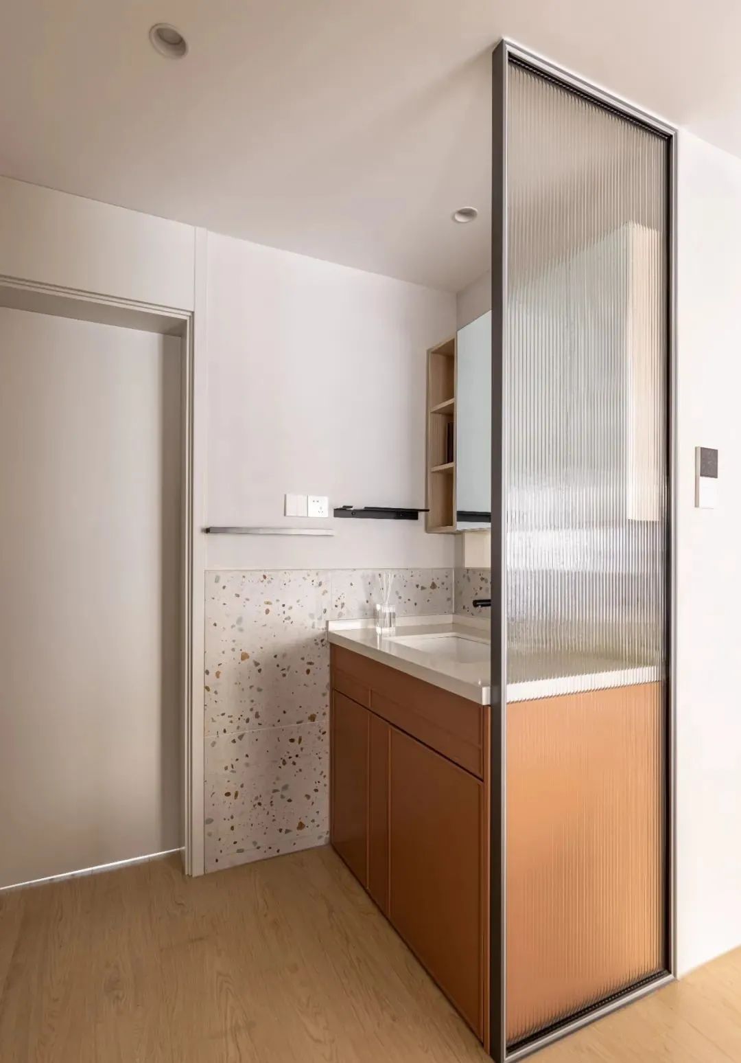 卫生间干区外移,还别出心裁加入一面长虹玻璃隔断,增加了空间的通透感。