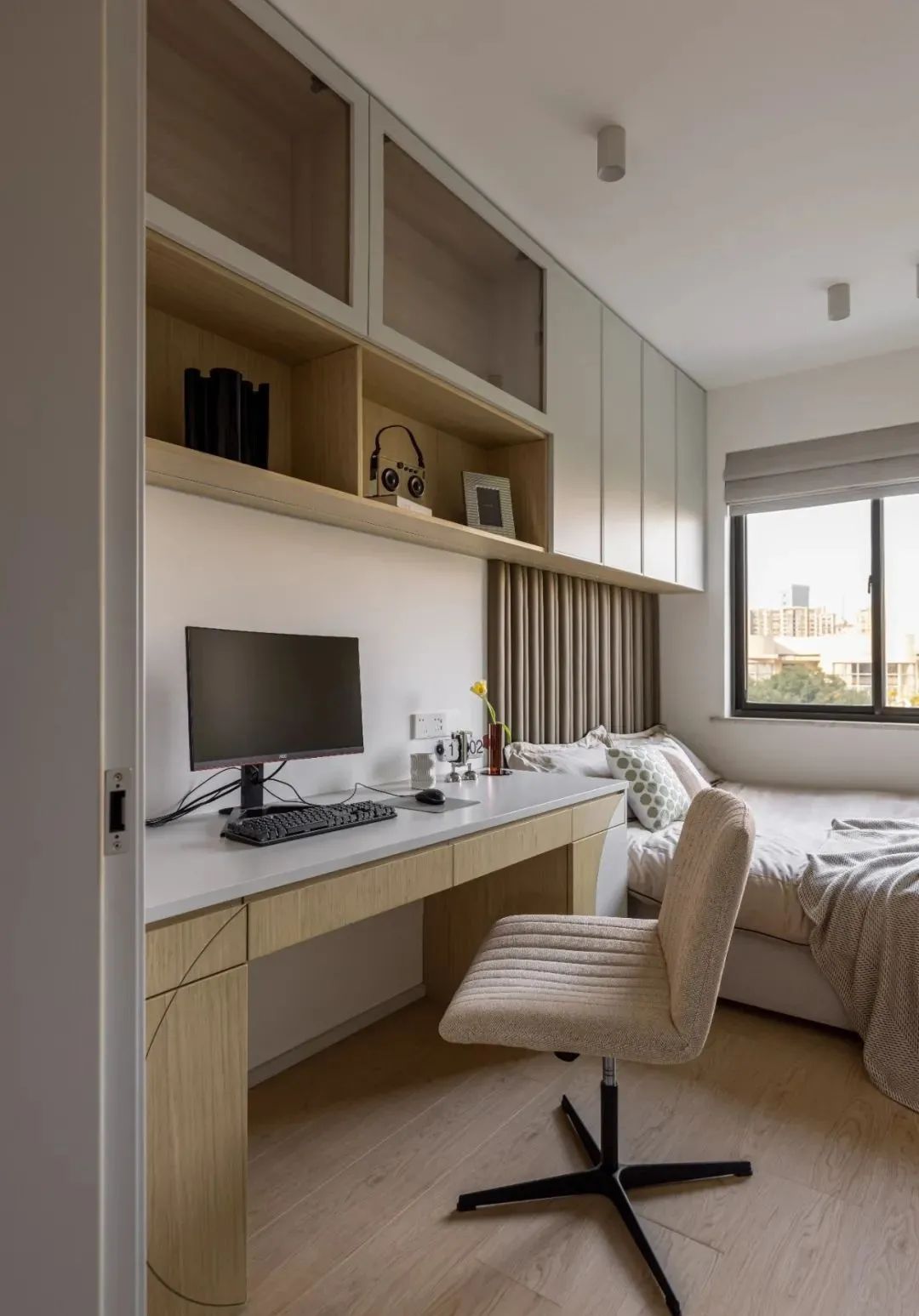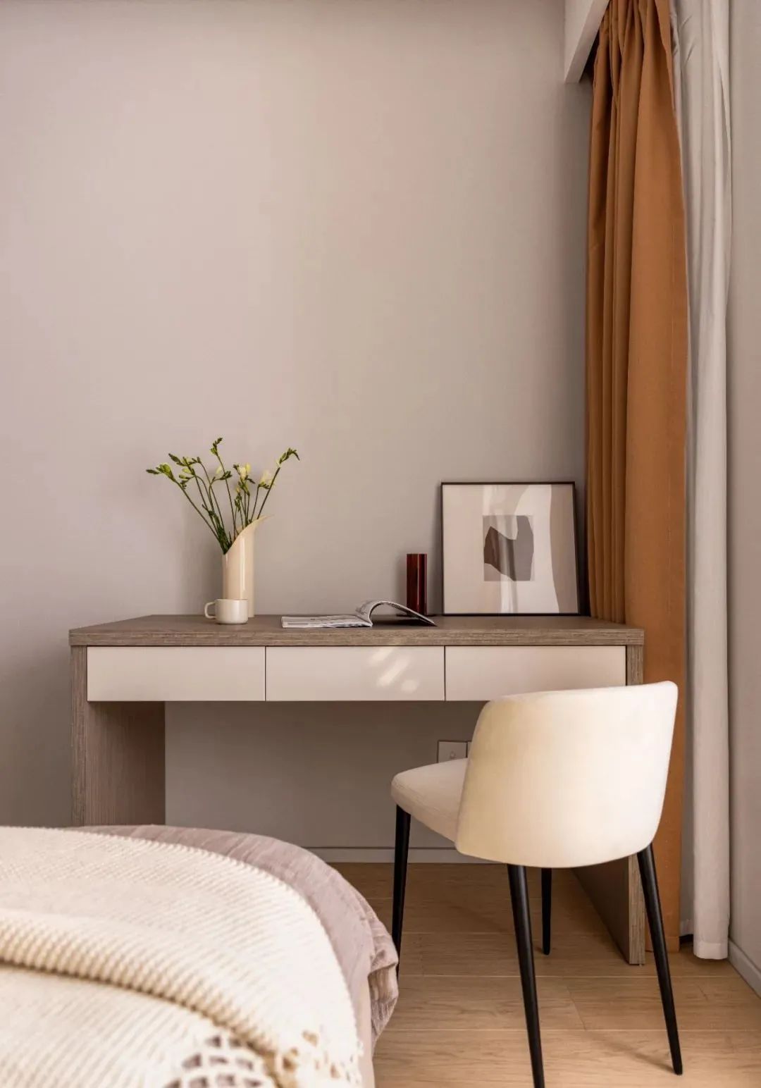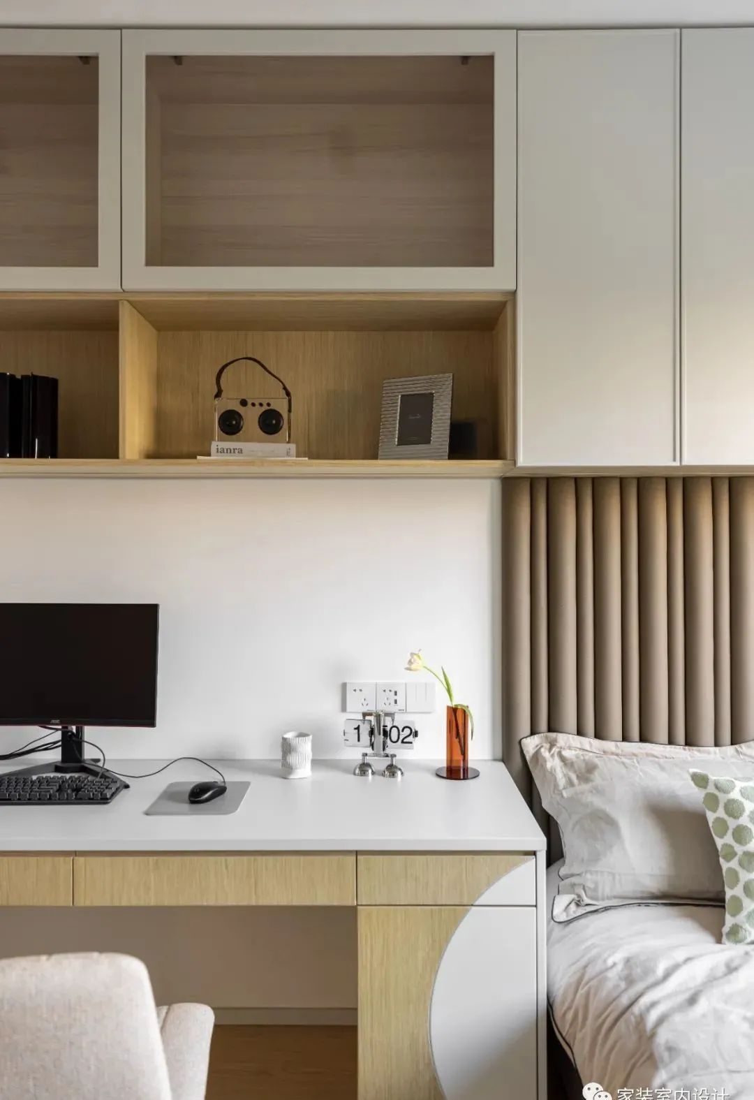 衣柜转角处的风格延伸更是增加了空间的整体性。床尾设计小书桌兼具梳妆台功能。