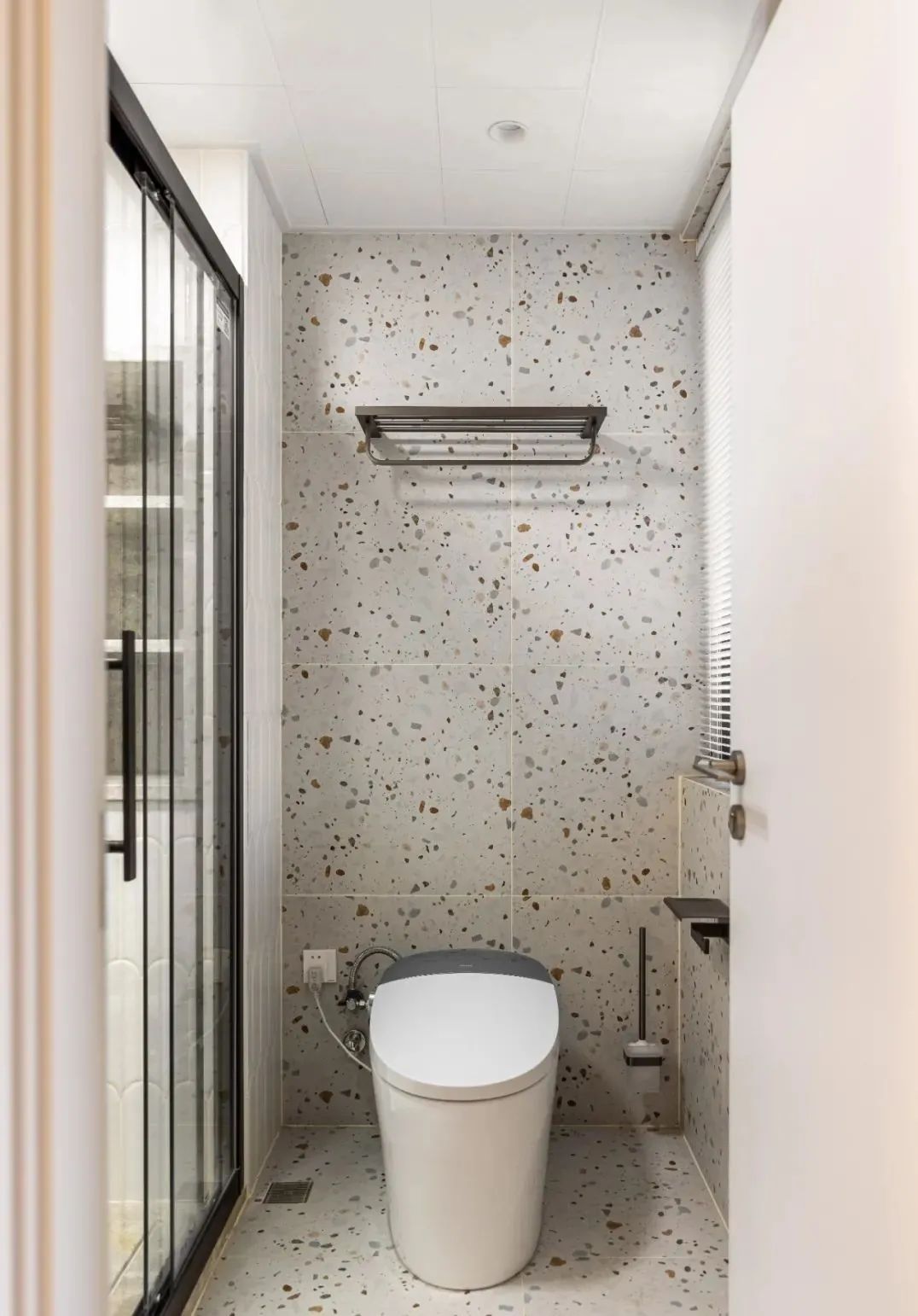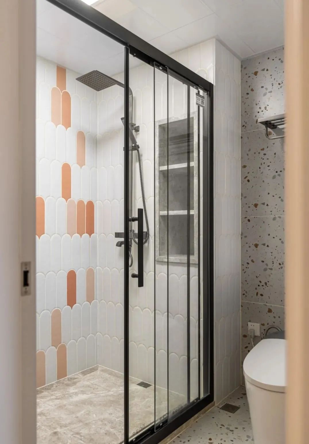 卫生间内部何用水磨石砖与白色弧形砖拼接铺贴,彩色小砖跳跃其中,增加空间活力。