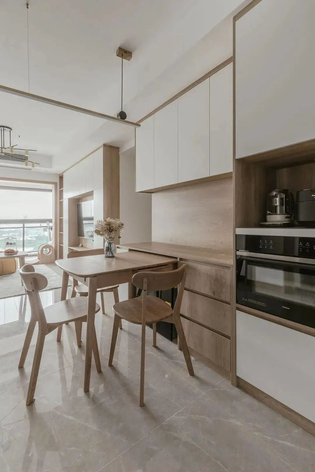 空间比较有限,取消了传统餐桌布置,利用组合柜+伸缩式餐桌,不仅解决了日常用餐问题,还让空间更开阔灵活。大容量的餐边柜设计,提供了足够多的收纳空间,同时还收纳了电器,释放厨房空间压力。