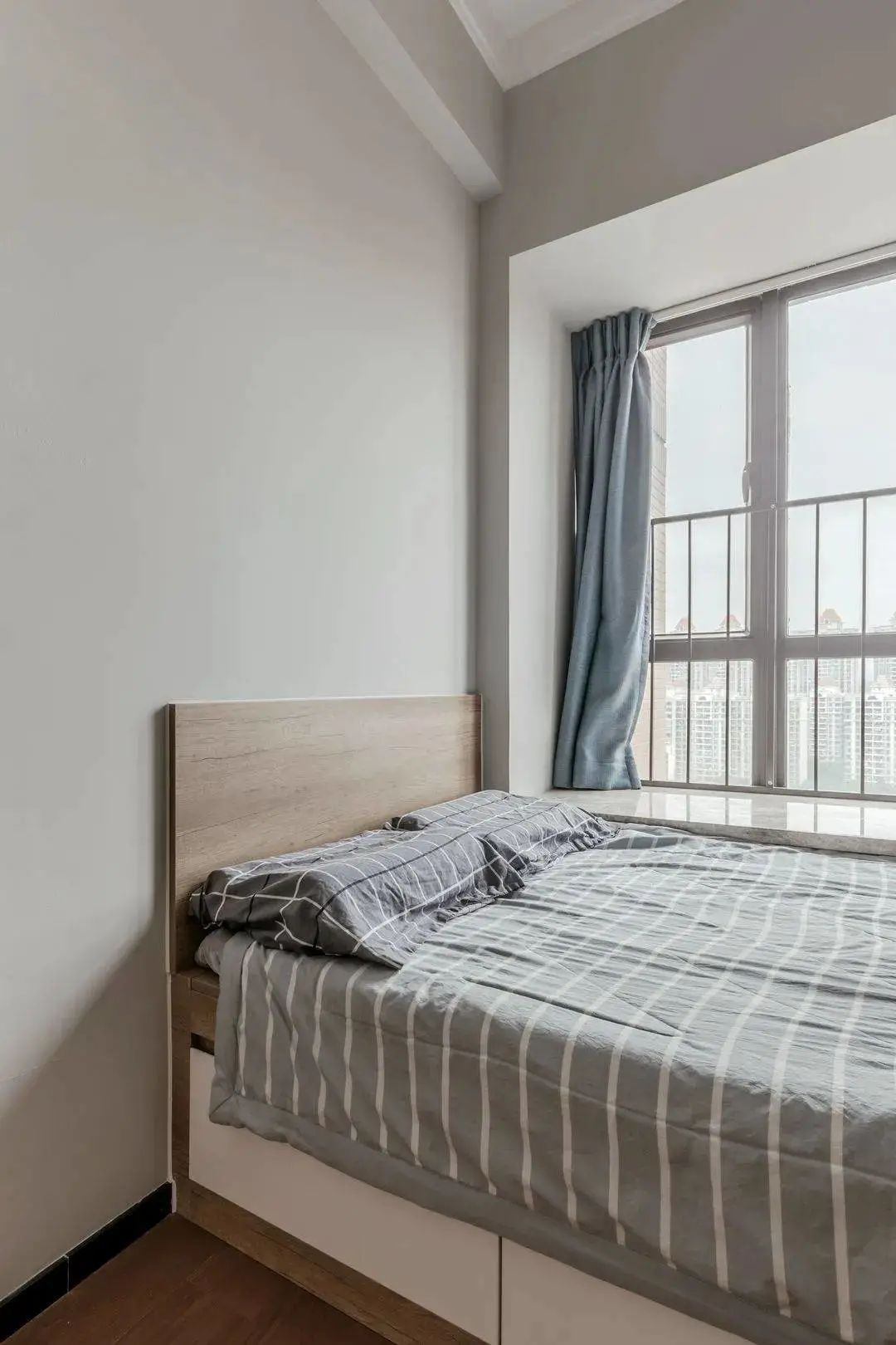 床头利用空间特性,采取不对称设计,一侧摆放床头柜,另一侧依托飘窗打造了梳妆台,节省空间又满足了女主梳妆需求。
