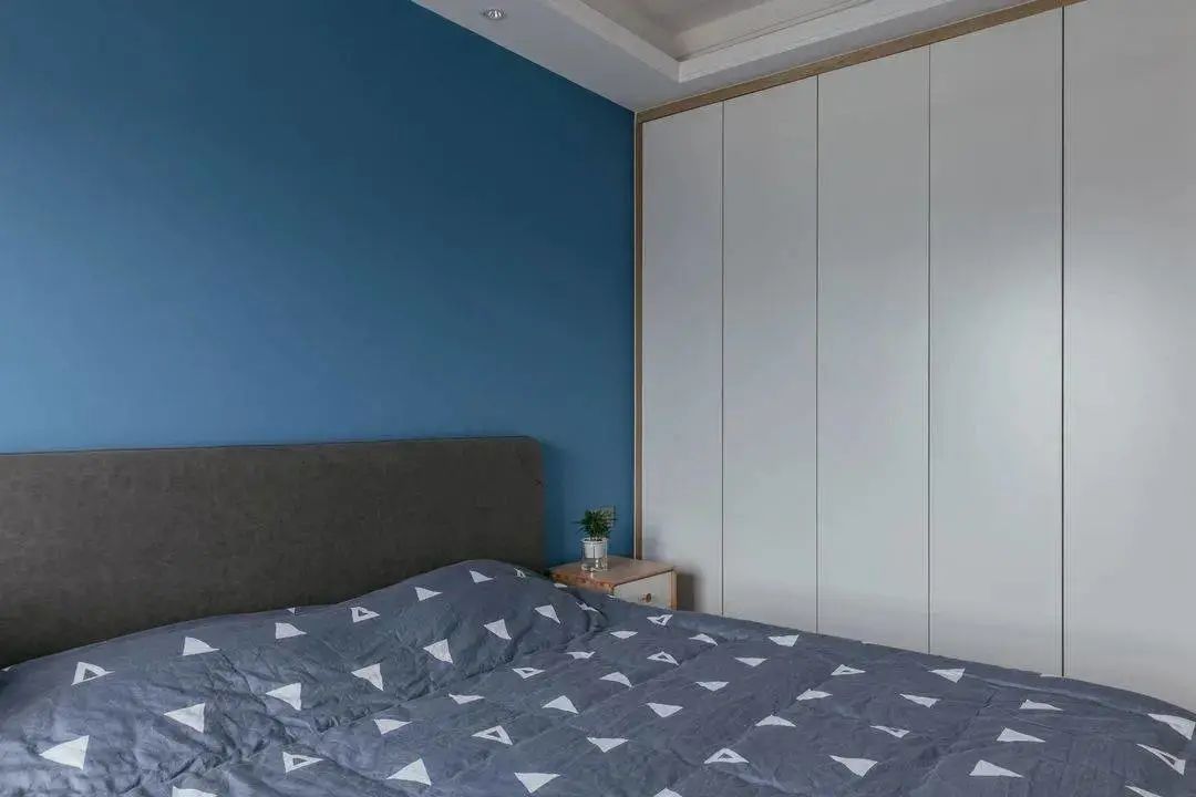 主卧延续简洁的格调,一抹蓝色背景墙设计,非常的亮眼。利用蓝色色彩特性,塑造空间静谧氛围。衣柜采用定制设计,纯白衣柜门板,加上无门把手的设计,让空间更显整洁宽松。
