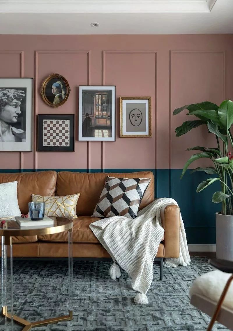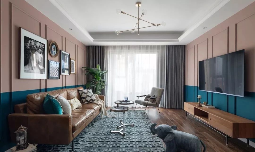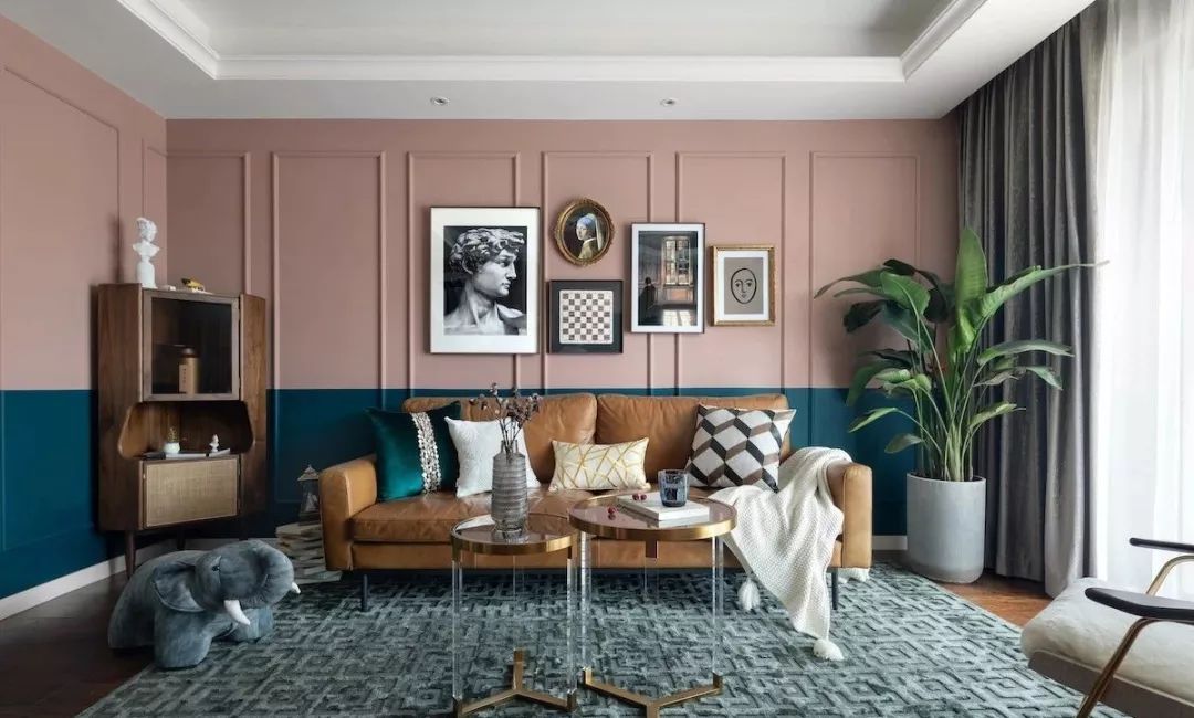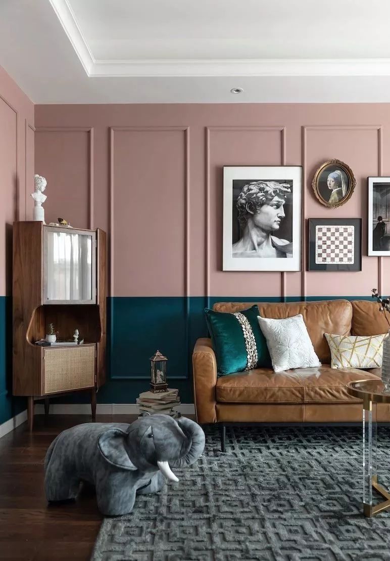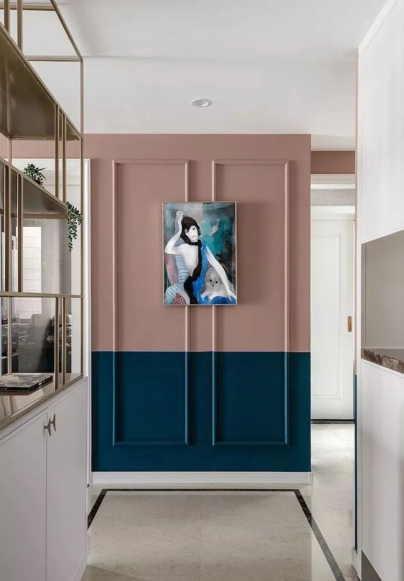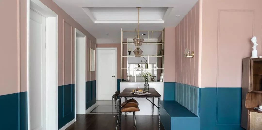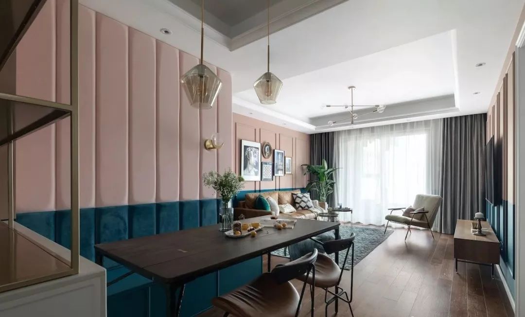 客餐厅的背景墙采用统一的色彩装饰,保证格调的一致性。粉色与孔雀蓝的撞色,高雅柔美。餐厅背景做了软包,大大提升了空间的舒适感。