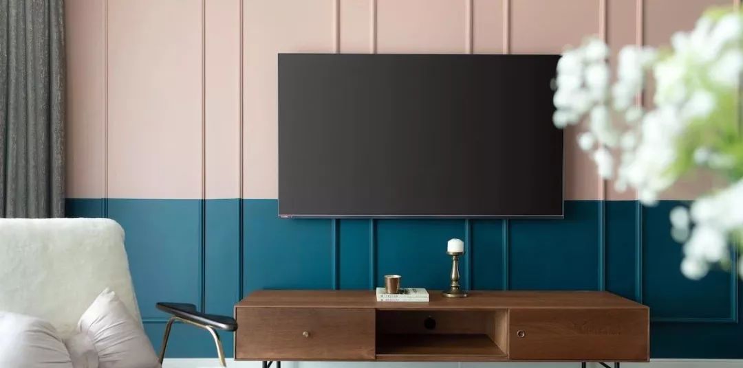 背景墙之间色彩呼应,电视机挂在墙面提升轻盈感,购置成品的电视柜做储物。