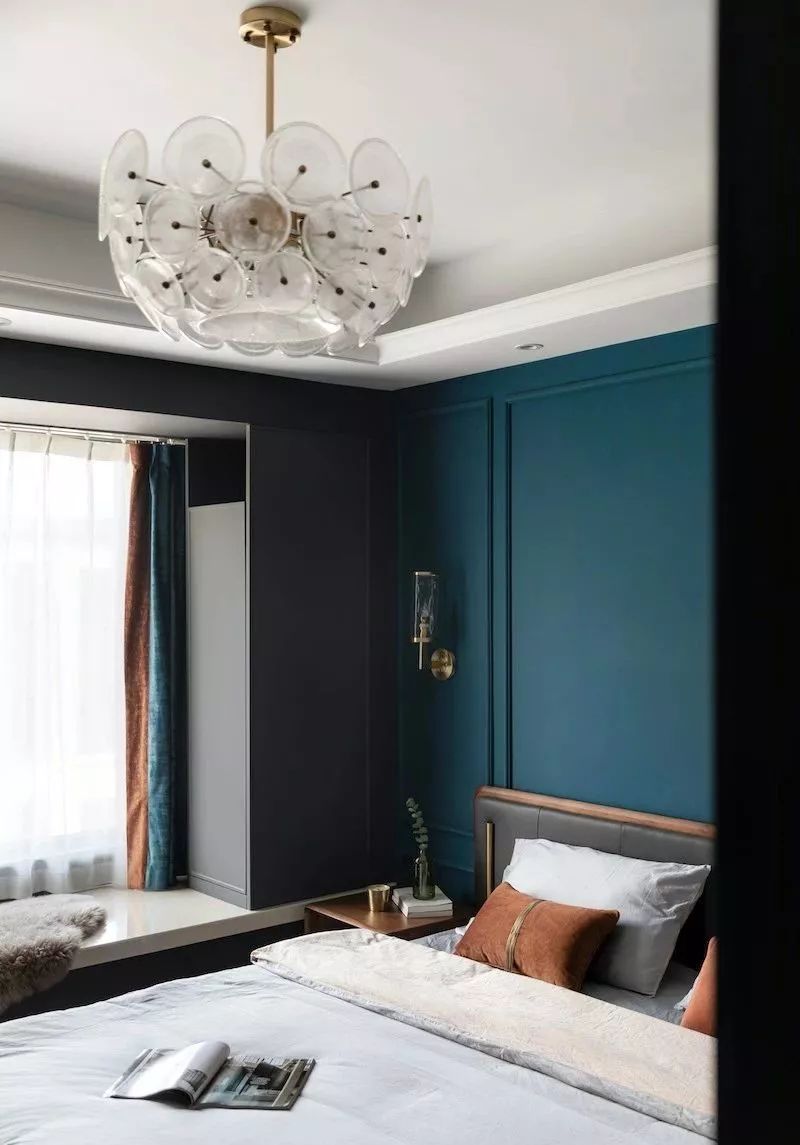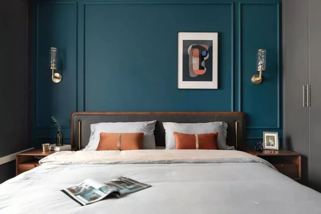 主卧选用沉寂的蓝色做主调,刚好也与客厅色彩形成呼应,再搭配灰色、橙色、木色,干练大气中透着精致的腔调。