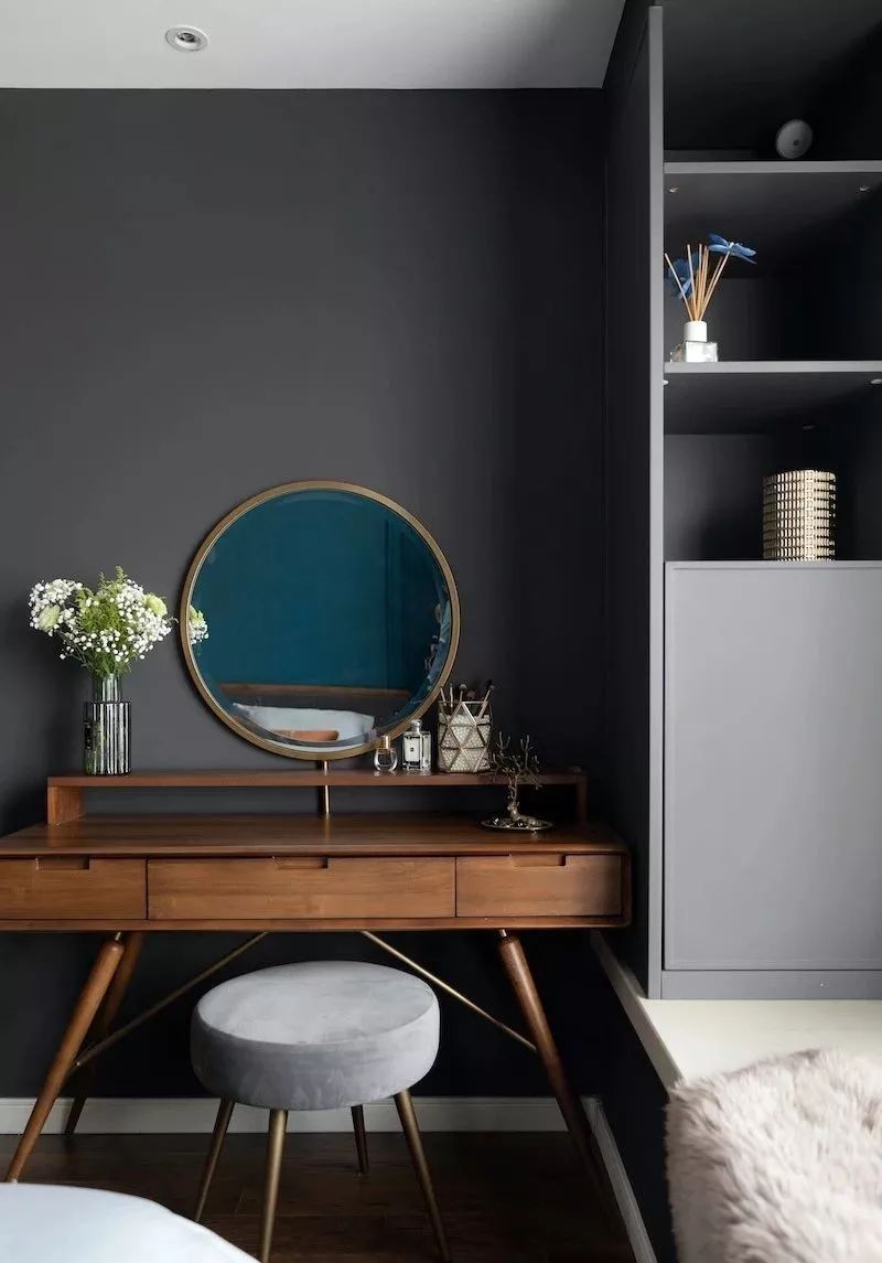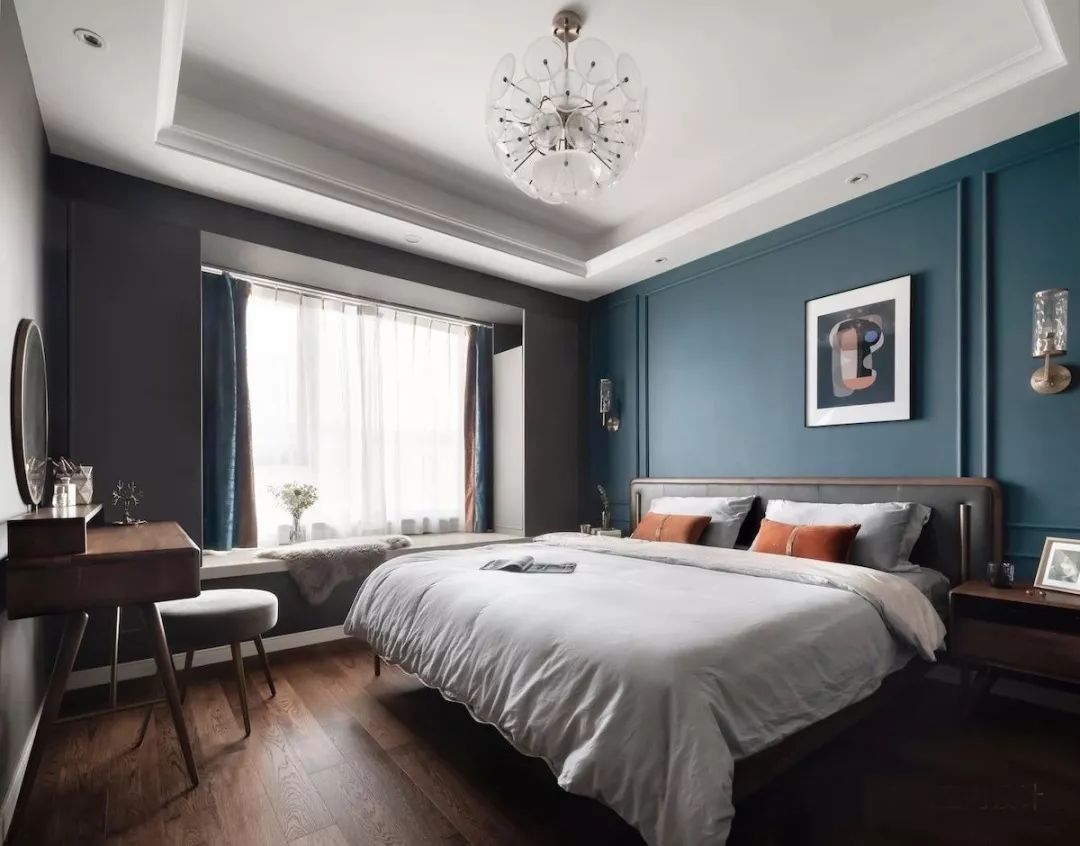 飘窗上增加了收纳柜,休闲实用两不误。床头的黑胡桃梳妆台与空间气质十分吻合,错层的设计让收纳更有序整齐。