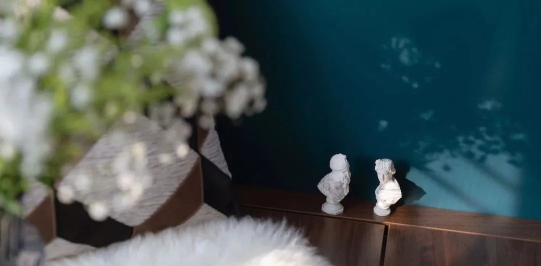 角落的斗柜颜值非常高,深棕色令它复古气息十分浓郁,刚好呼应墙面的艺术装饰画。玻璃+黄铜设计的茶几,轻盈通透而有质感。