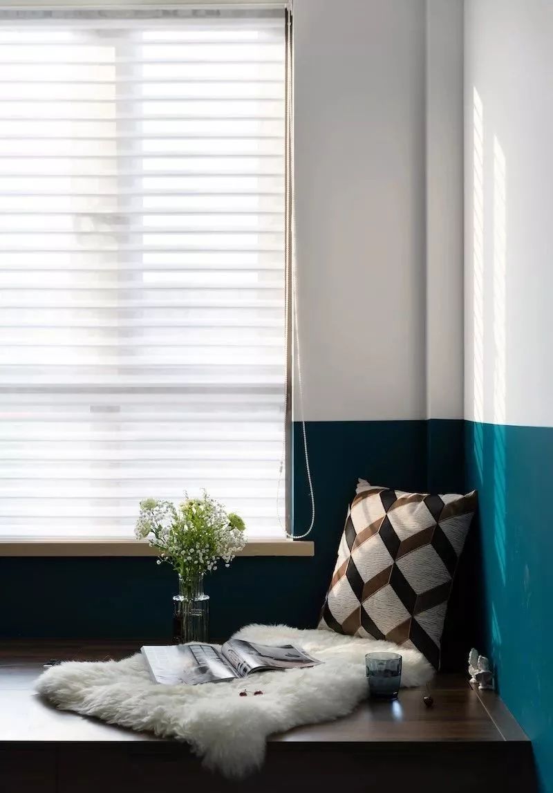 同样利用飘窗增加了储物柜,开放式的柜子用于放书籍、摆件都是很不错的。