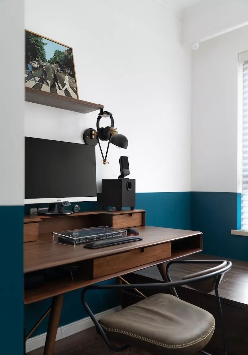 书房延续了客厅的孔雀蓝色,搭配胡桃木定制家具,宁静优雅而又充满自然复古的味道。