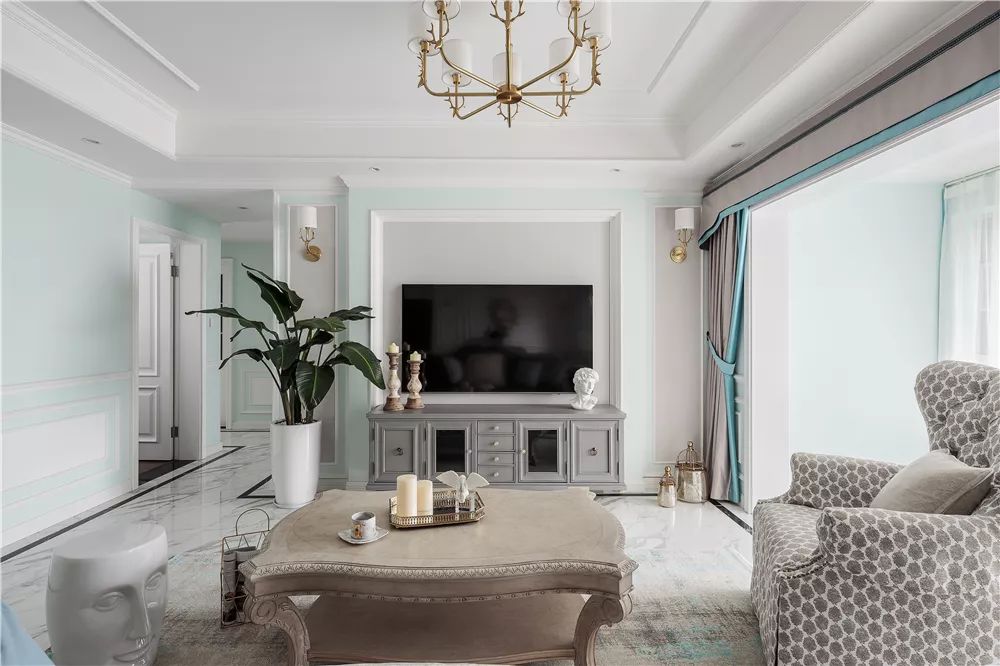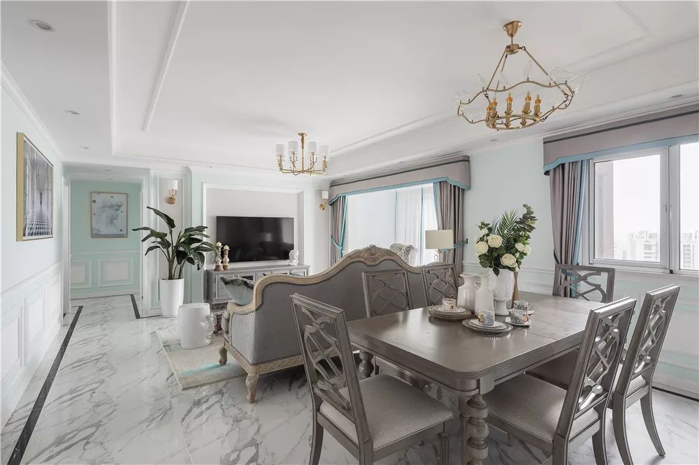 整个客餐厅的沙发、茶几、餐桌椅和灯具、挂饰等都是比较端庄、典雅的造型,在主体小清新色彩的搭配下,让人感觉非常优雅、大方。