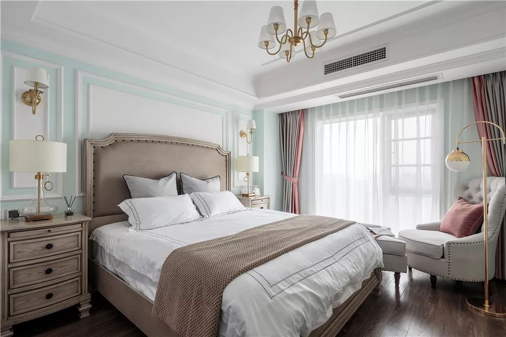 床头背景墙上用石膏线做了装饰线条,带来更多美式风的感觉。床尾处摆放了一张布艺休闲椅,坐在这里看看书、晒晒太阳,也是非常惬意。