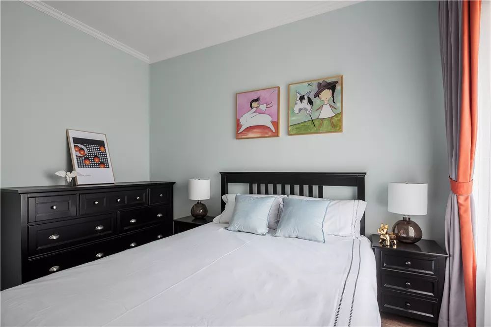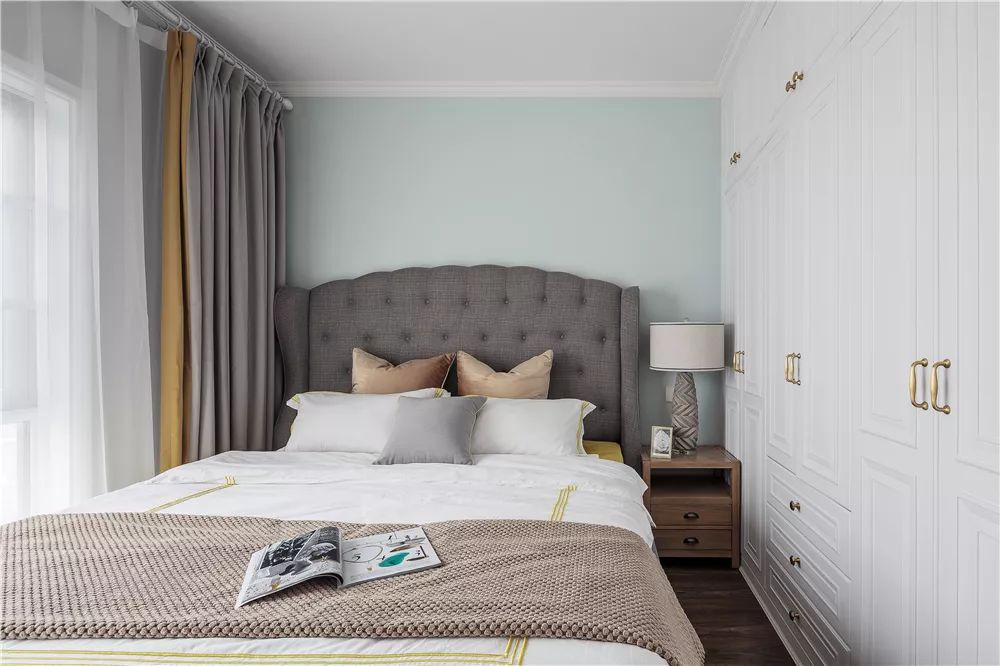 次卧同样保持清新舒适的空间感,灰色的布艺床头靠背,加上美式风的造型与细节作为点缀,给次卧带来了典雅的气息。