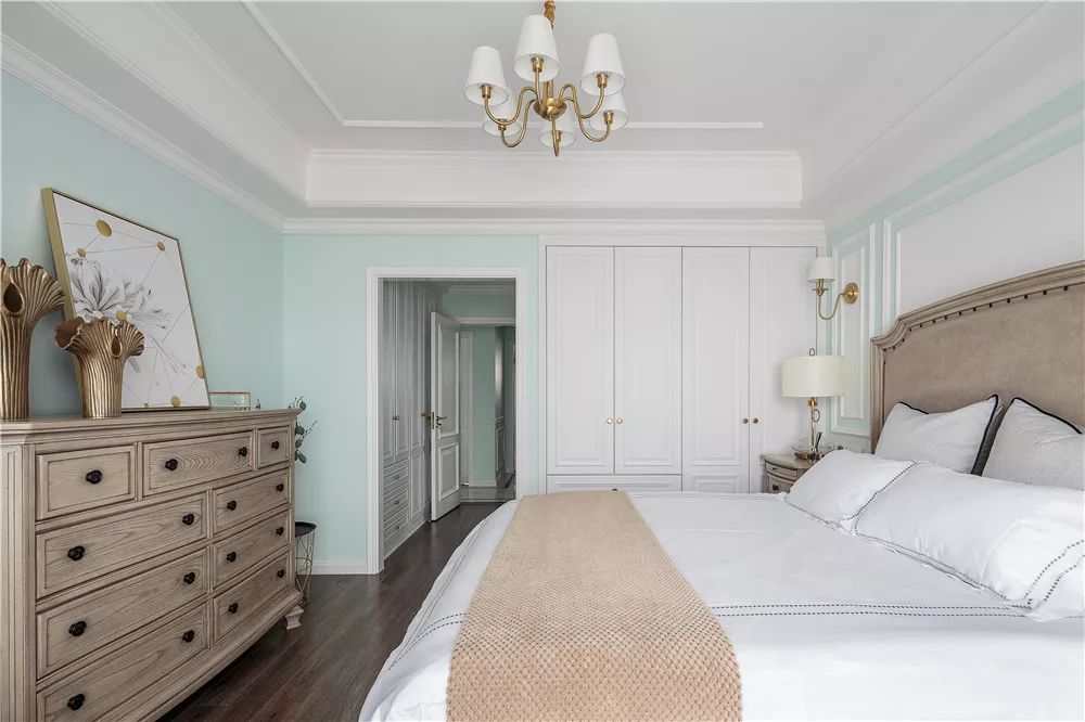 主卧室延续了客餐厅的颜色搭配,白色的衣柜加上浅绿色的墙面,搭配中色调的斗柜、床头柜等等,让卧室看起来更加清新舒适。