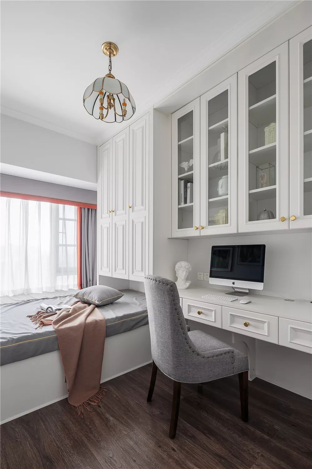 书房是做成了榻榻米加上组合式衣柜、书桌柜的设计,在工作之余也能休憩一下,书柜做成了玻璃柜门,拿取书籍也方便一些。