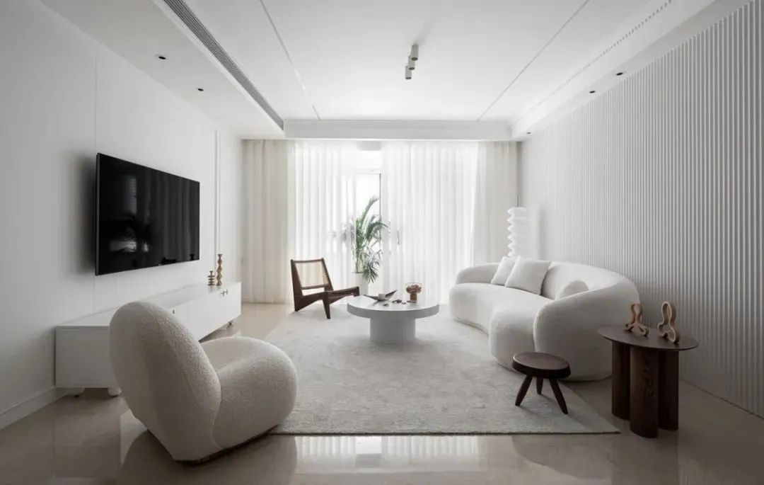 客厅采取无主灯的天花,结合整体素色的硬装+软装,营造出一种朴素极简的设计效果。