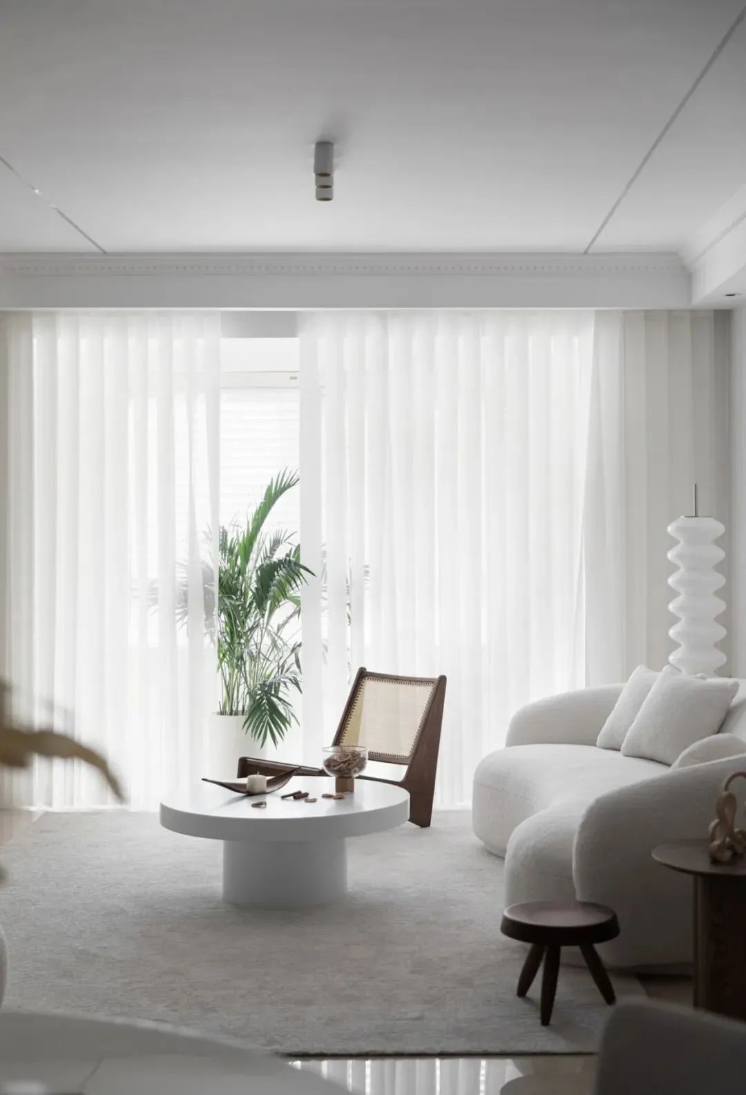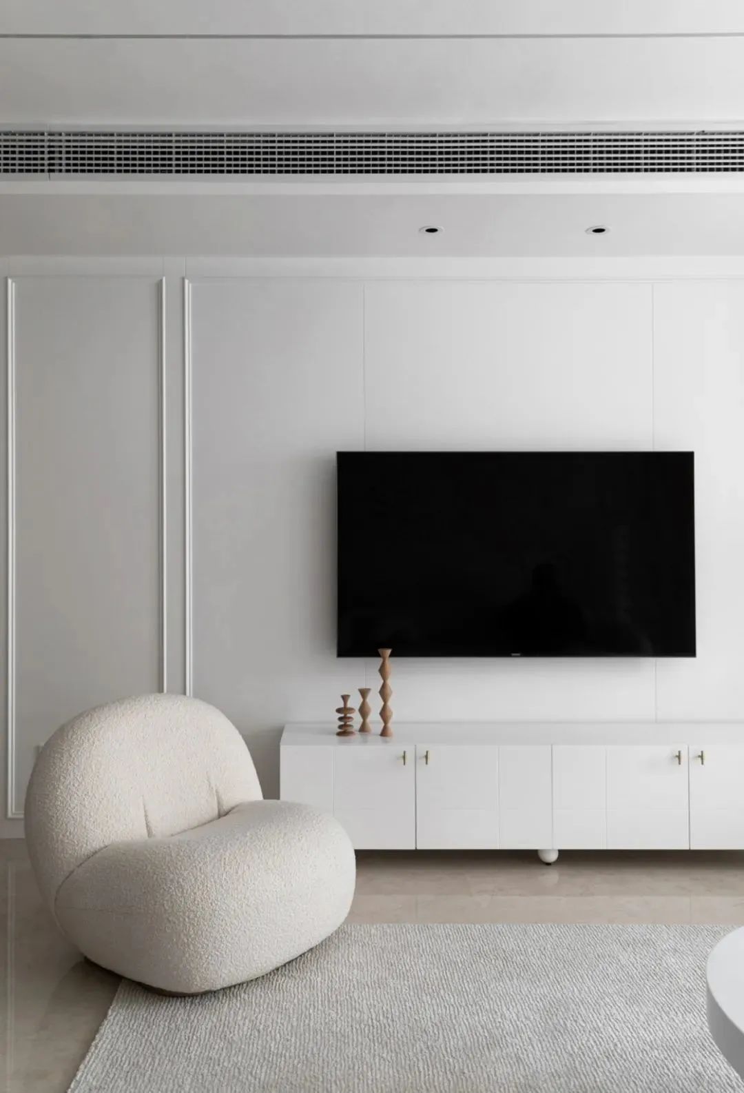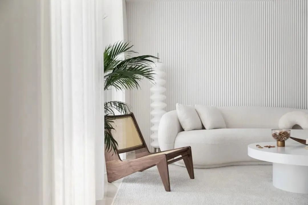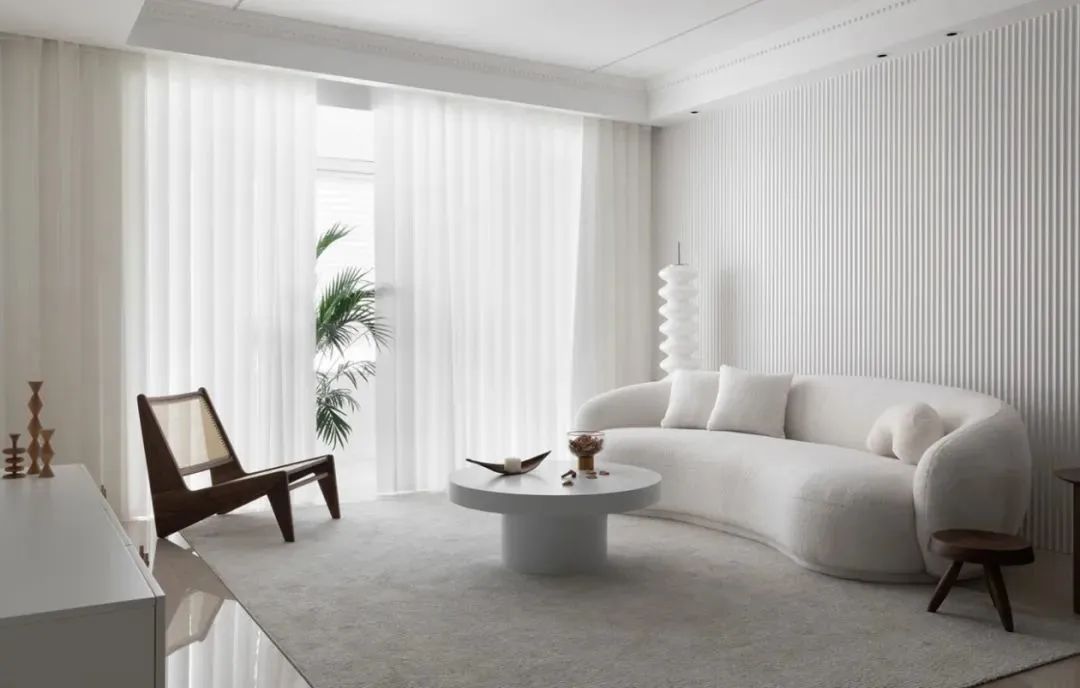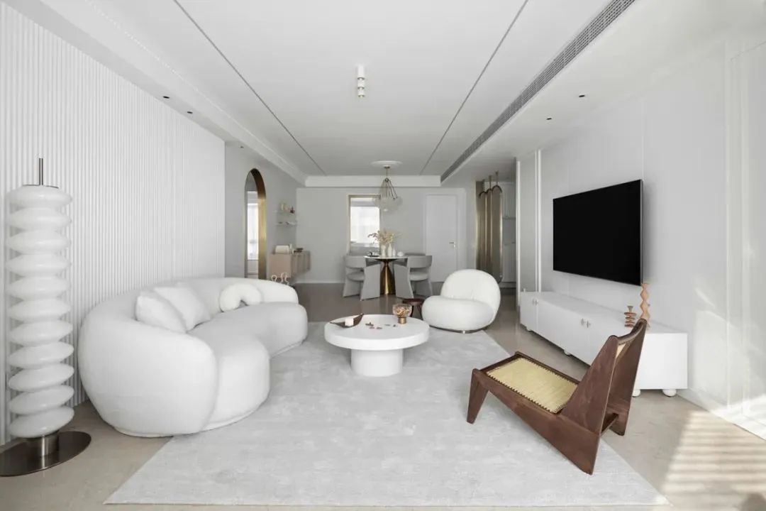 沙发墙以白色长城板为装饰背景,摆上外形带有弧线的优雅米白色沙发,结合白色圆形茶几,地面铺设浅灰色布艺地毯,整个空间都充满了简雅高级的气质。