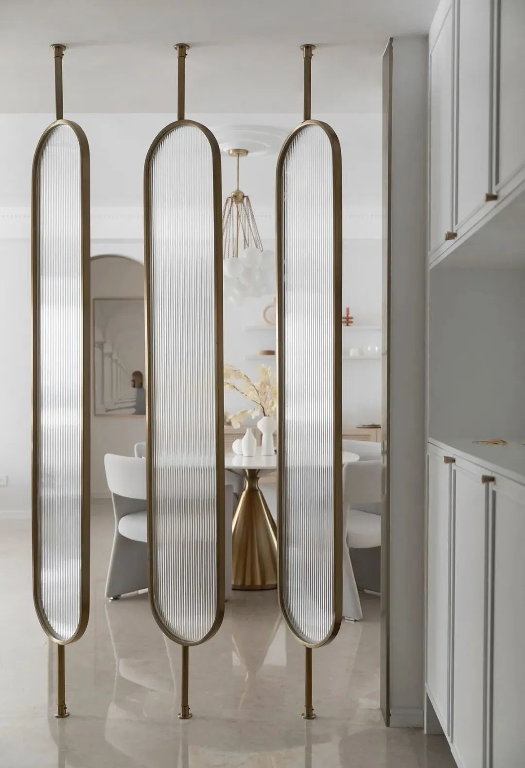 玄关的大门对着餐厅区域,在中间加入3道金属+长虹玻璃的椭圆造型屏风,后方精致的餐桌椅布置若隐若现的效果,让人一进门就感受到了一种轻奢优雅的高级。右侧鞋柜在底部与中间加入开放空格,装上轻奢的柜门,也让玄关功能实用优雅。