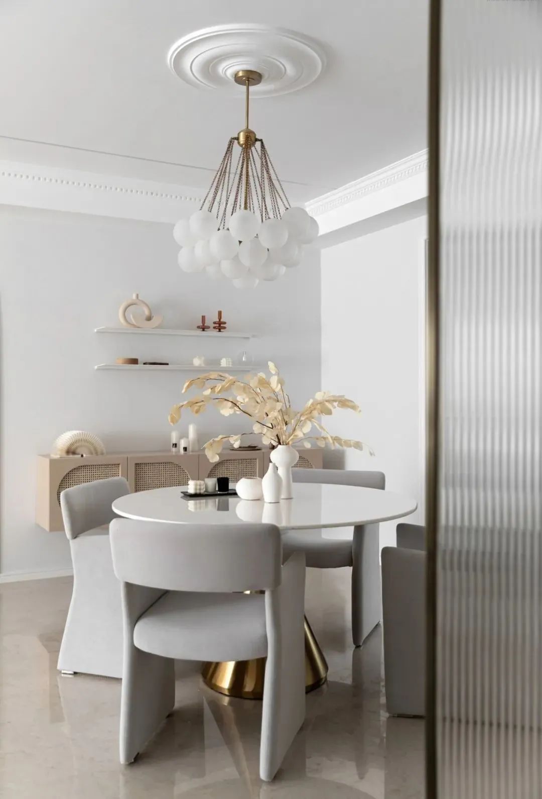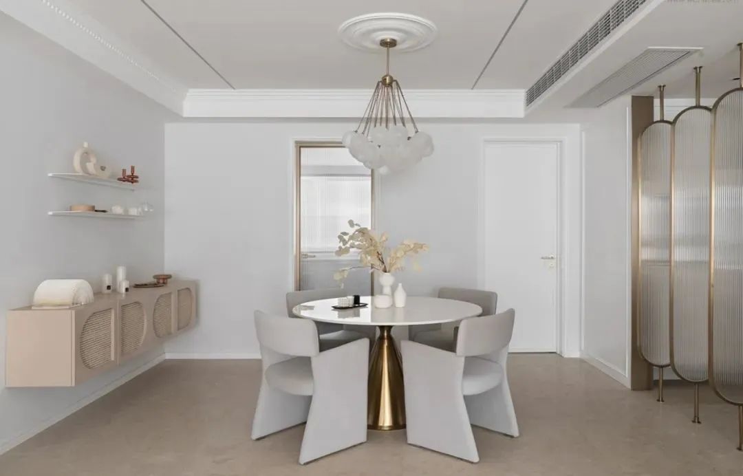 餐厅与客厅保持一种的淡雅色调,左侧装上一个悬空的木色餐边柜,布置精致优雅的装饰画,带来一种精致优雅的氛围感;中间布置金属脚架的大理石台面餐桌,结合灰色皮艺餐椅,也让用餐空间显得实用华丽又端庄。