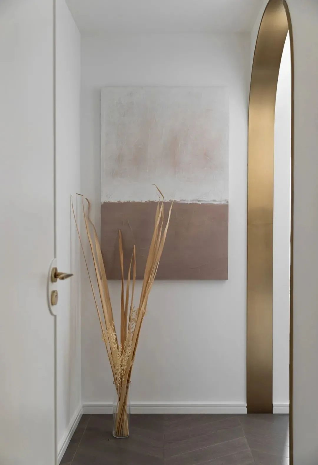 进入卧室,首先是一个小“玄关”的过渡空间,墙面的棕色-白色渐变的朴素装饰画,下方还有一个小玻璃花瓶,插上干枝叶的装饰,搭配金色不锈钢的拱形门洞装饰,带来一种独特的朴素与精致感。