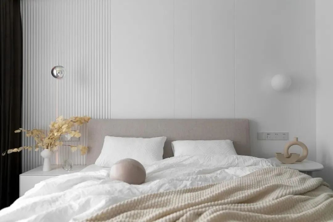 床头墙左侧布置花瓶与银色吊灯,右侧加入独特的摆饰品与白色球形壁灯,中间布置卡其色的床头靠背,布置洁白的床单枕头,让卧室显得简洁优雅而舒适。
