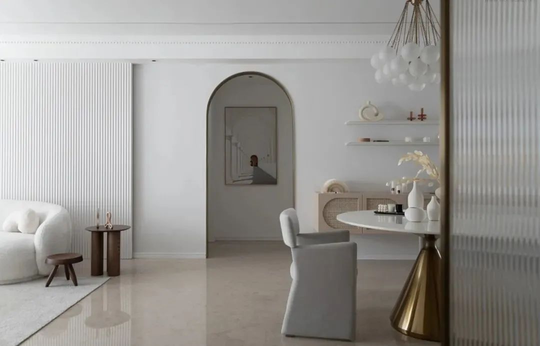 餐厅与客厅之间的过道,以拱形门洞造型,墙面挂一幅立体感的建筑风装饰画,使得过道空间有着一种视觉延伸的错觉,放大了角落空间的视觉感。
