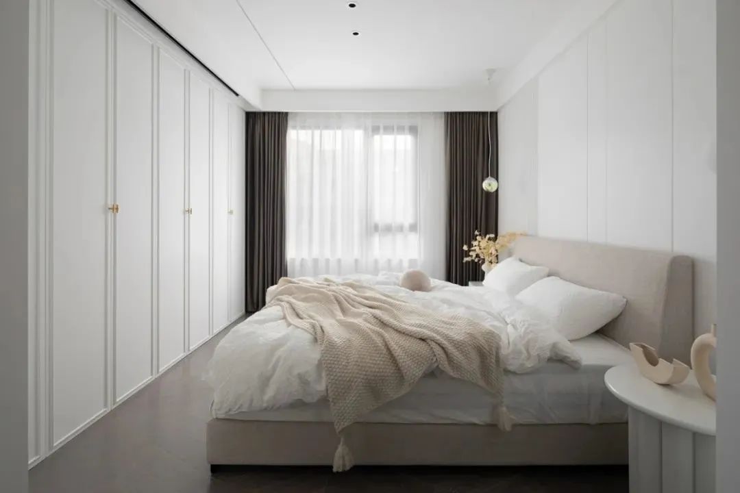 米黄色布毯放在床上,在净白的空间,营造出一种淡雅舒适的氛围;床尾一整排的衣柜,并在天花加入电动幕布,为主人提供了更加轻松优雅的卧室休闲体验。