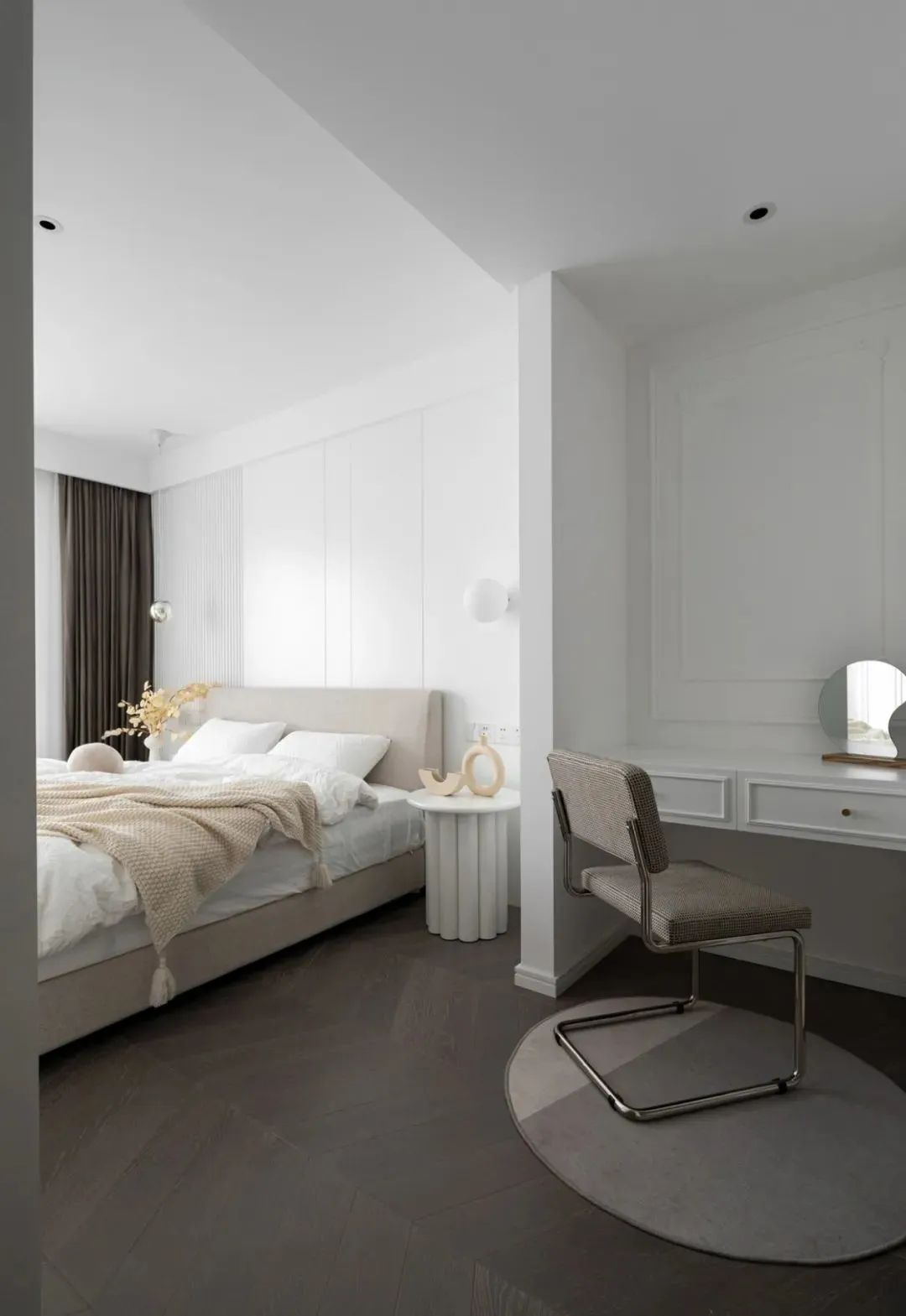 卧室旁边的小角落还加入了一个小梳妆台的位置,椅子下还有一张圆形地毯,为主人营造了一个轻松优雅的化妆小角落。