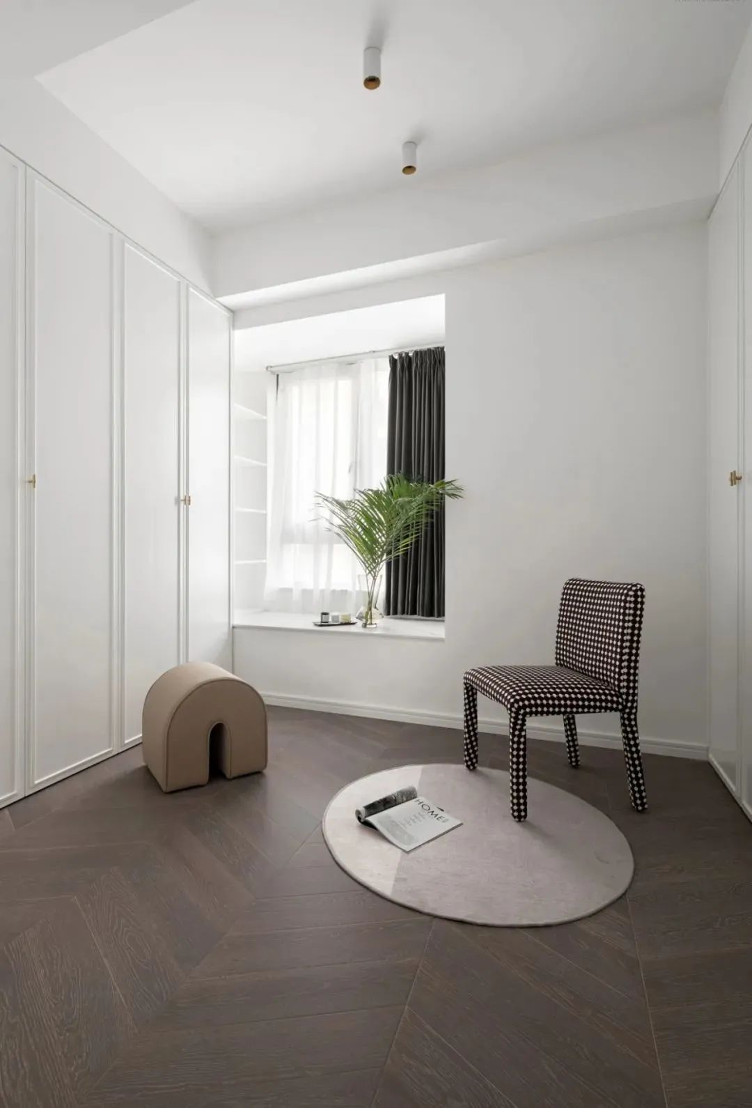 次卧空间定制一排衣柜,地面是鱼骨铺的木地板,摆上休闲凳、地毯,飘窗上布置摆饰品与花瓶插花,让次卧也显得精致清新而优雅。