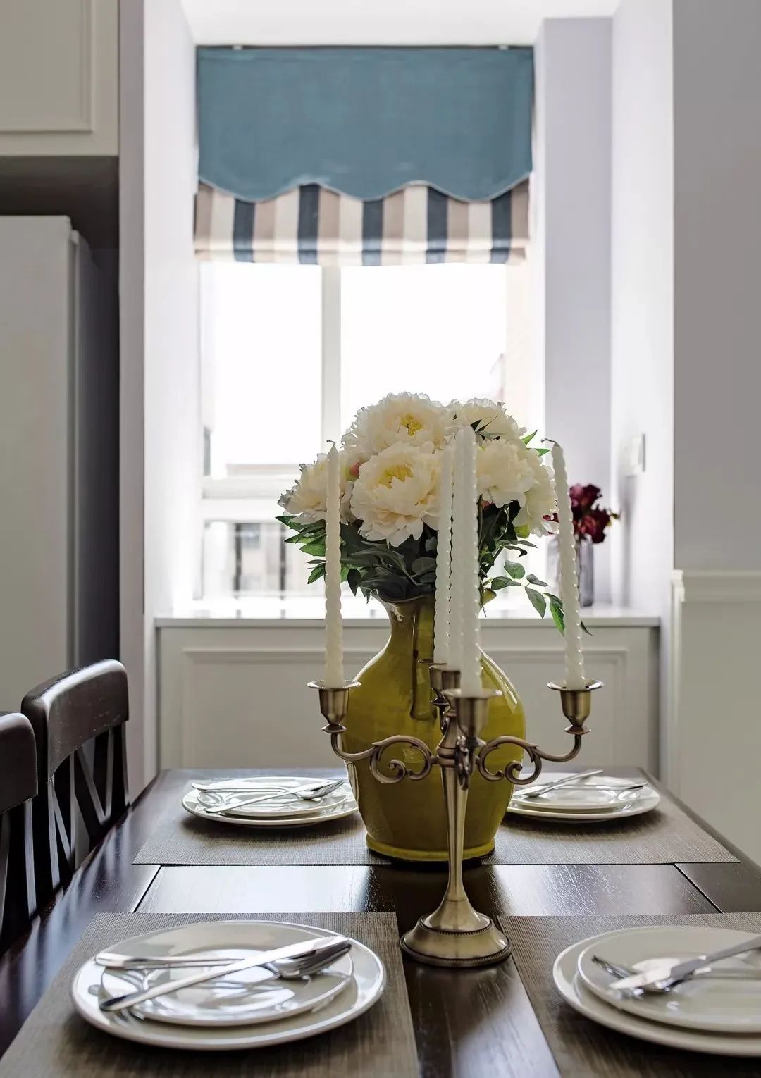 餐厅处的设计比较简单,摆放在正中的餐桌椅,用浪漫的软装来打造一个优雅精致的进餐空间,角落里的冰箱嵌在柜子里,非常实用。