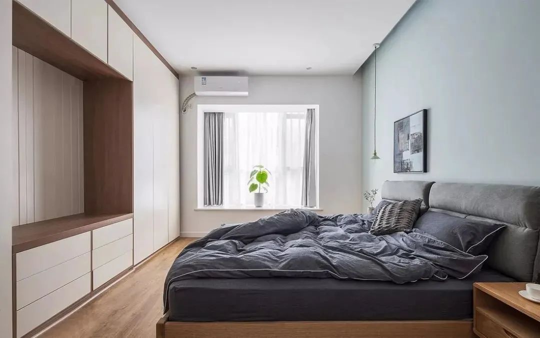 主卧是莫兰迪色系的背景墙面,有助于睡眠,对面的柜体大大增加了卧室的收纳。