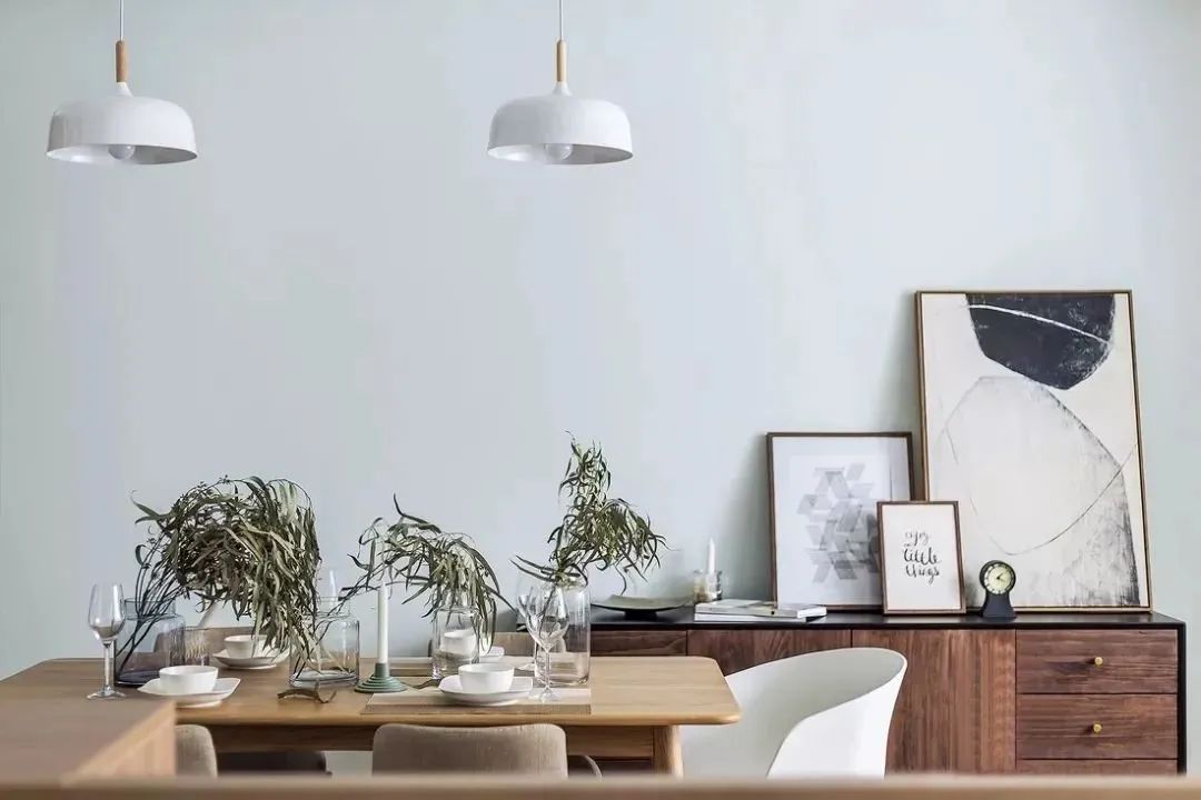 餐桌与边柜的木色深浅不一,过渡明显,越加凸显层次感,整体自然清新。两盏吊线灯烘托了整个空间的氛围。