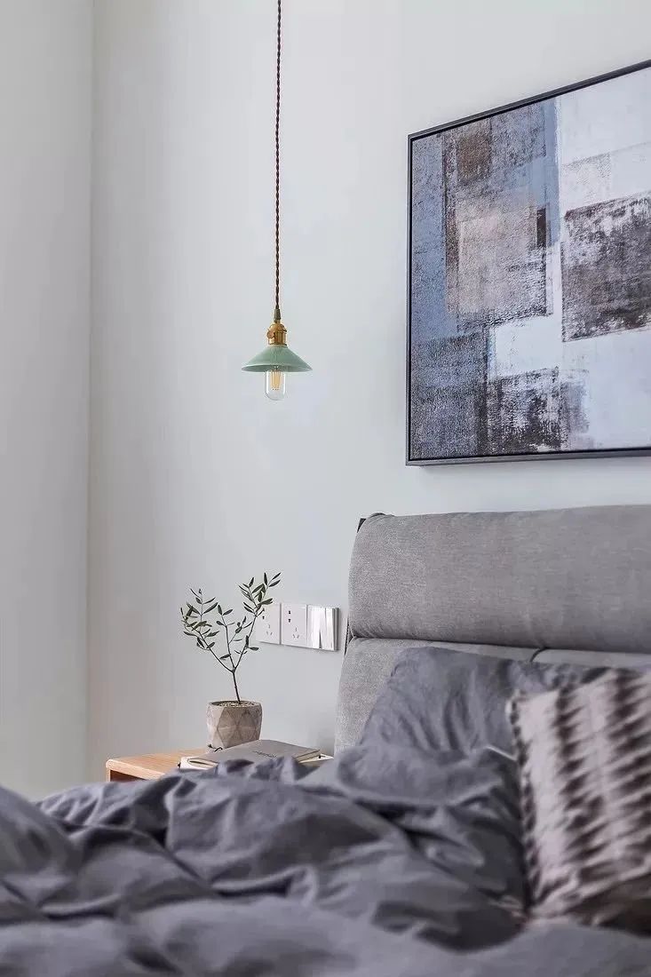 床头柜上是两个五孔插座与一键双控开关,方便充电和灯光的调控,上方的吊线灯比起台灯来说更为节约空间。
