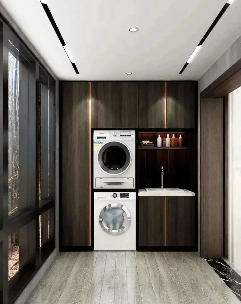 如此设计,洗衣机柜上方是吊柜,中间则是水槽。如果家里洗手台不多,这样设计绝对是恰到好处。实用方便的同时也能节省洗漱时间。