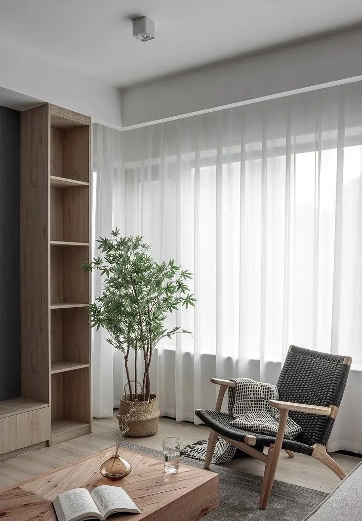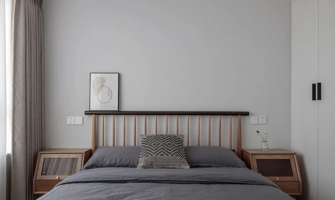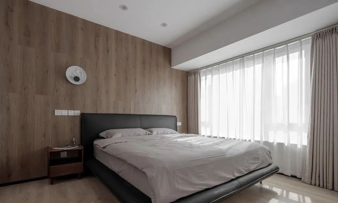 纹理不同深浅的原木材质、魅影黑的大床与丝绸般床品的交融,呈现出“不正宗”日式难能可贵。木地板背景墙,与地面颜色稍作区分,即达到立体层次的充分体现。