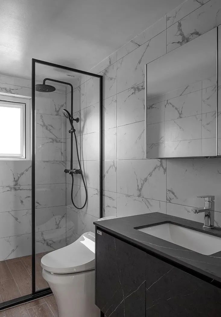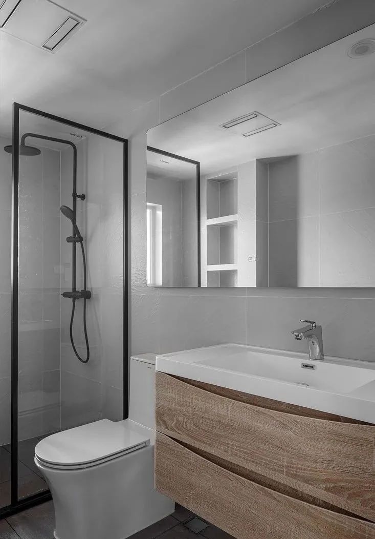 以白色的墙面砖,使卫浴空间呈现干净大方的沉静气质。使用一扇玻璃隔断即可解决来自淋浴时的水花四溅,做到干湿分离。