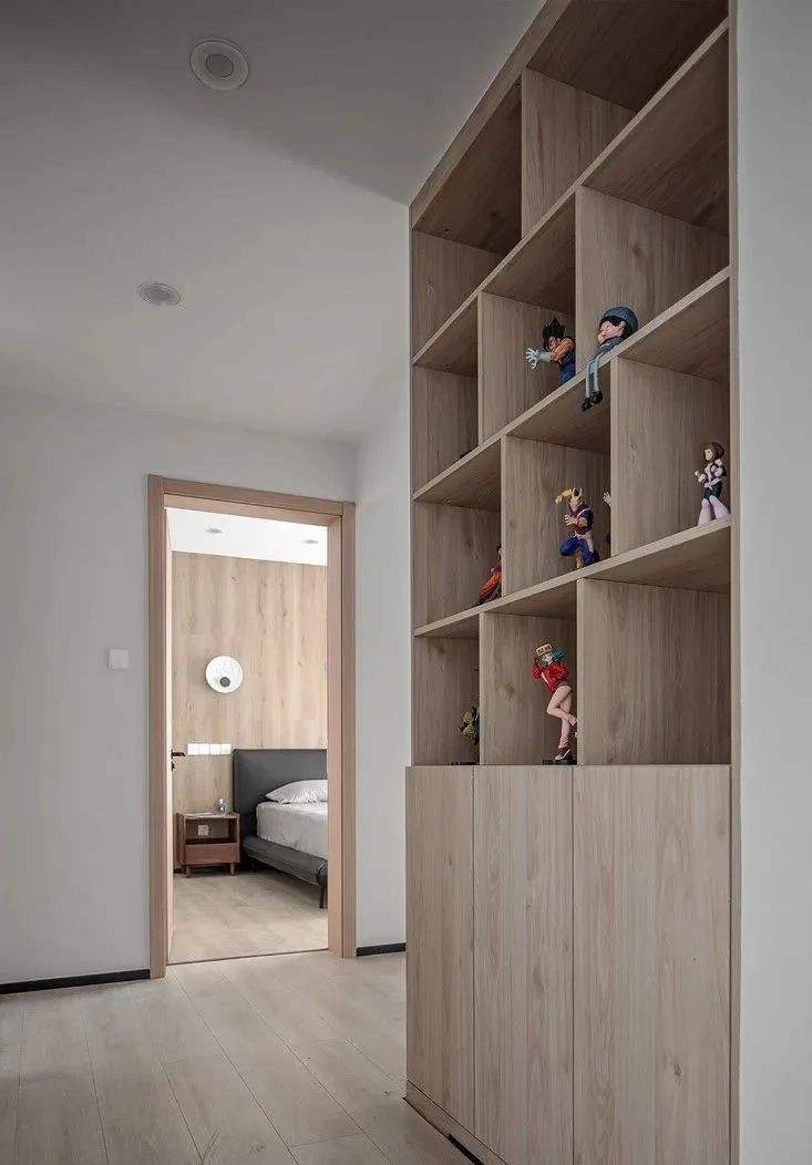3、借用书房小面积,移动主卧门的位置,避免与入户门正对,还增加主卧储物空间,也预留出特意展示手办的储物柜。