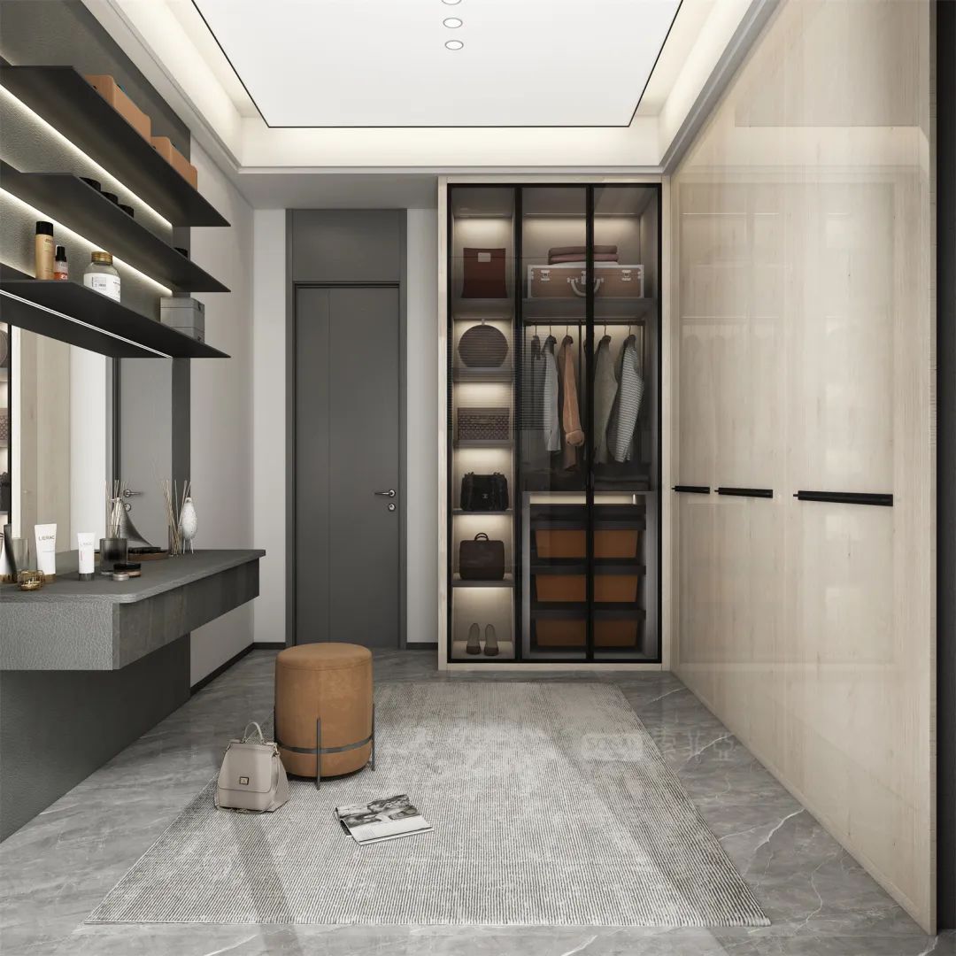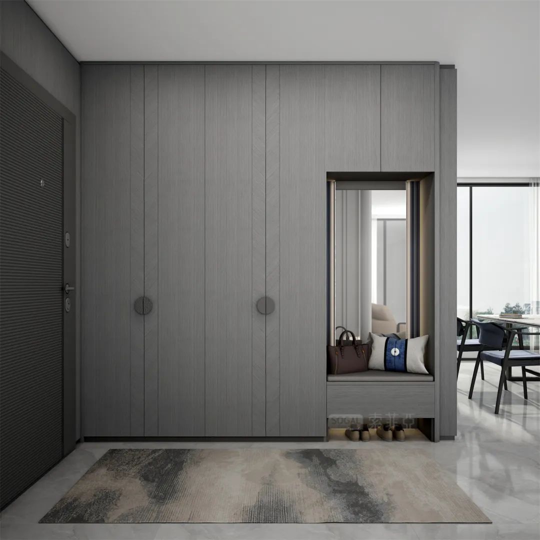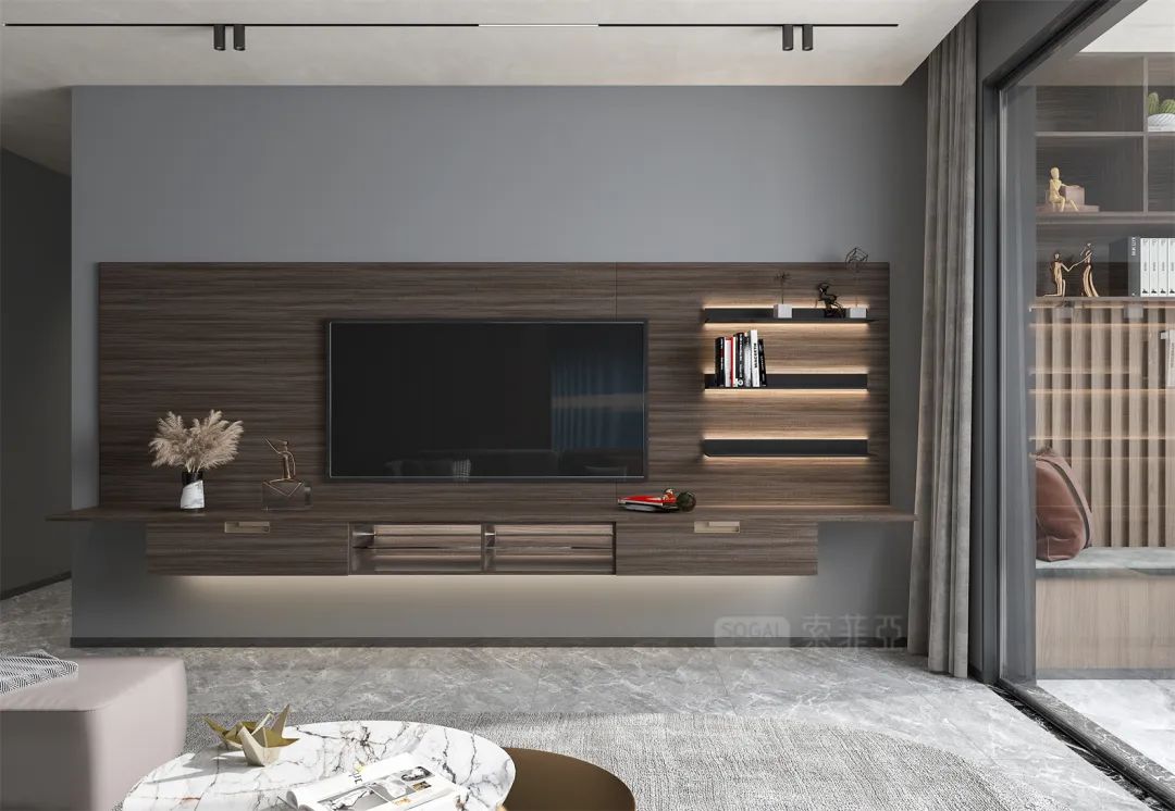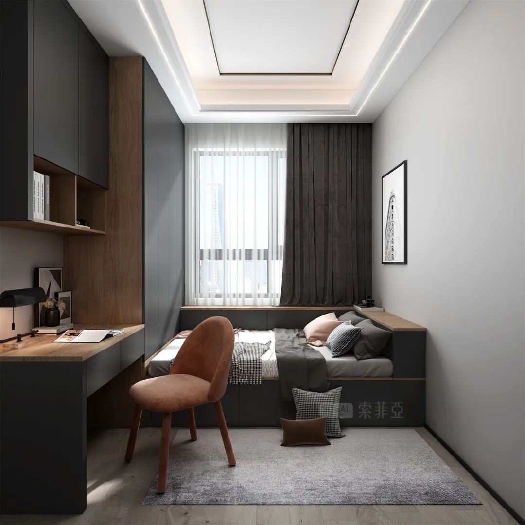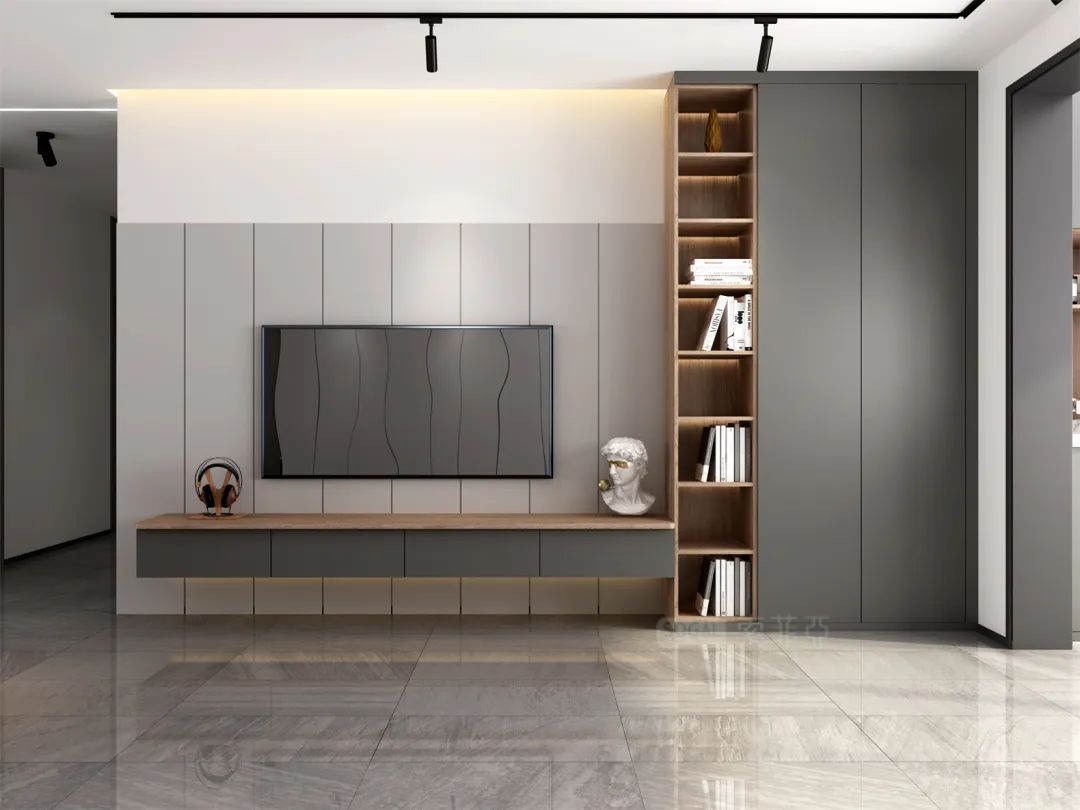 深灰+深色原木,撞色感更强,给人更强烈的视觉冲击,诠释着强烈的现代都市气息。