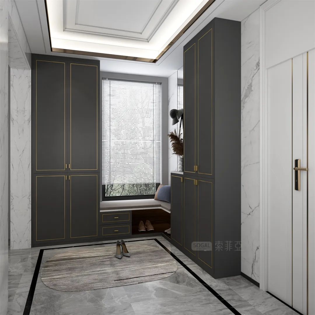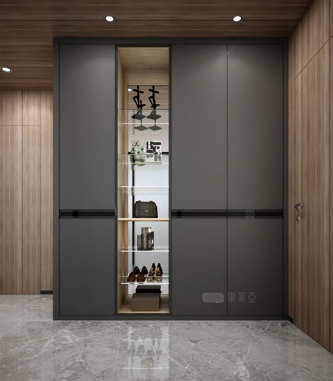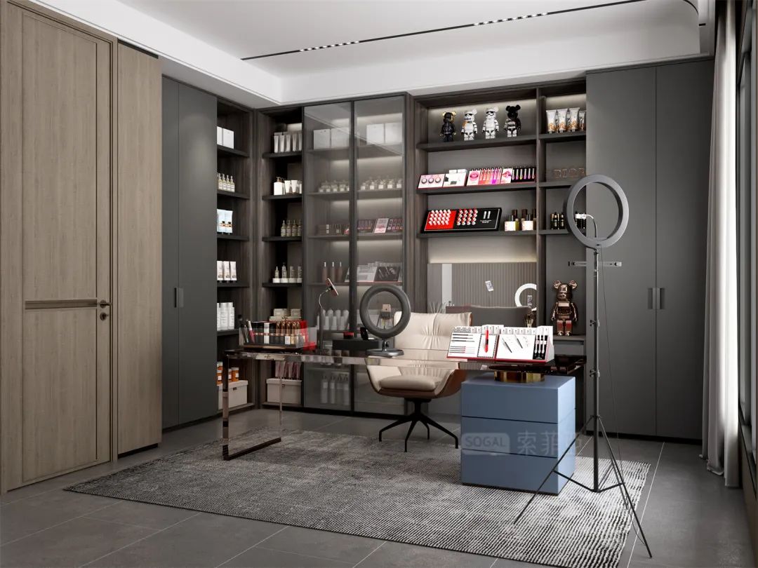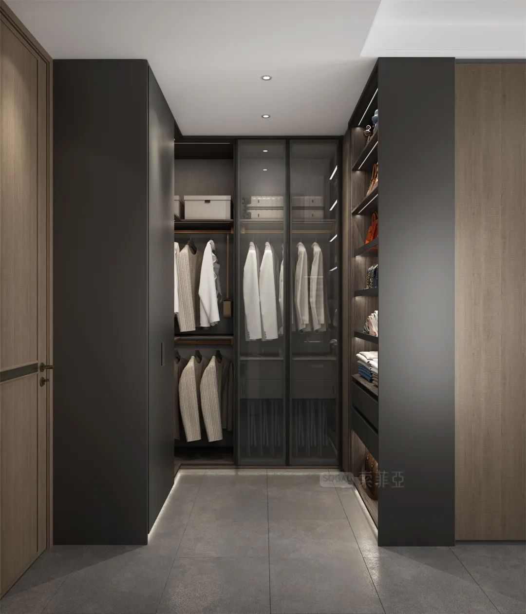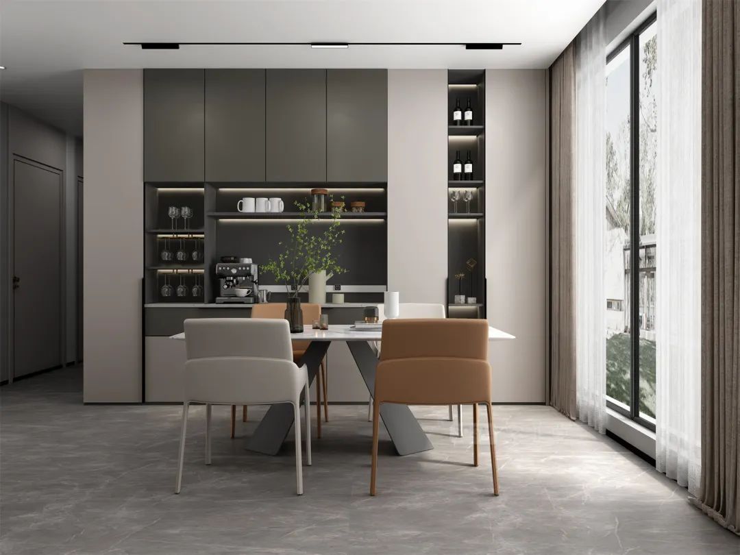 深灰+深色原木,撞色感更强,给人更强烈的视觉冲击,诠释着强烈的现代都市气息。
