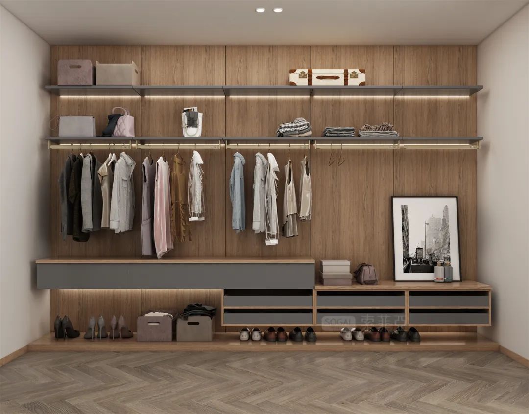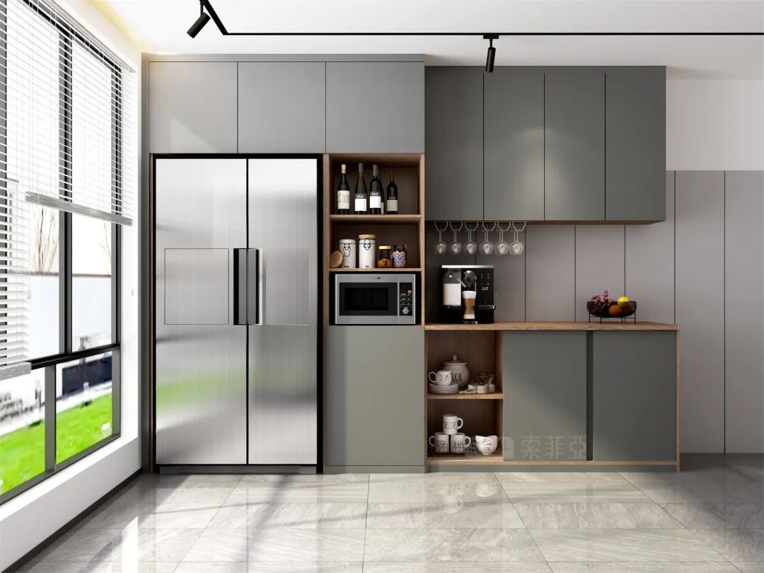 木纹自带温馨质感,和“高冷”的灰色调融合、撞色,搭出不失质感的居家温度。