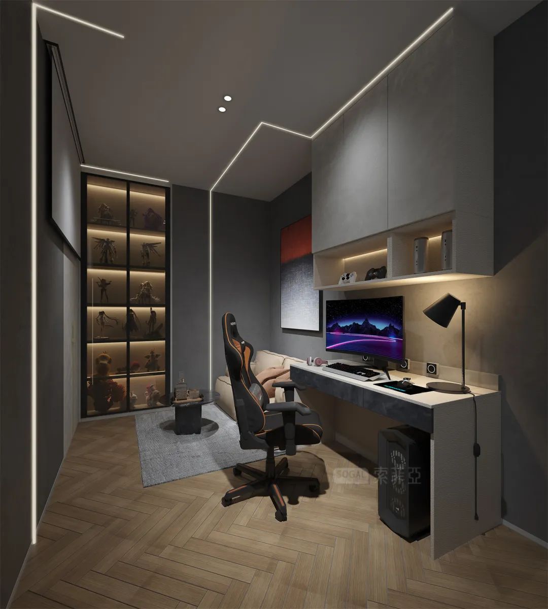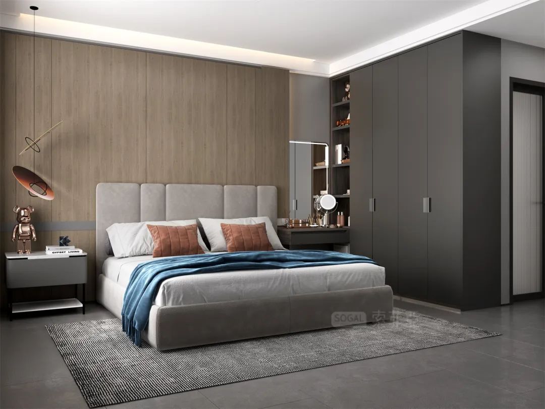 低明度灰色+浅原木色,搭配柔和的灯光氛围,舒适的个人空间,谁看了都爱!