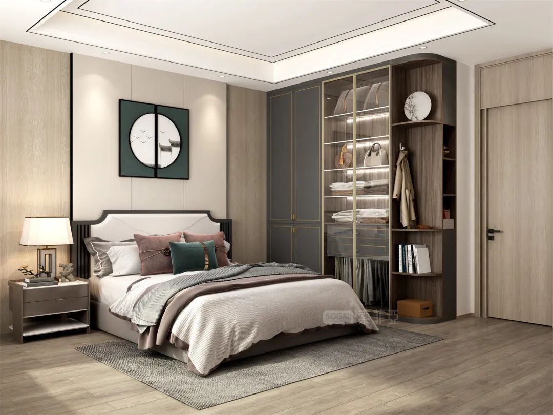 无论是柜体、地板、背景墙等硬装,还是沙发床品窗帘等布艺软装,都可巧用【灰+原木】这一搭配。