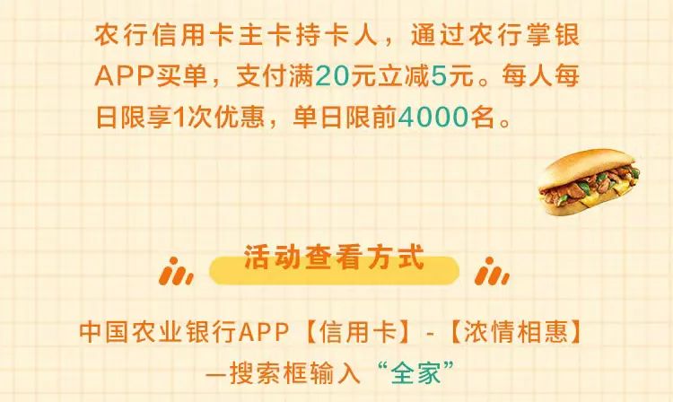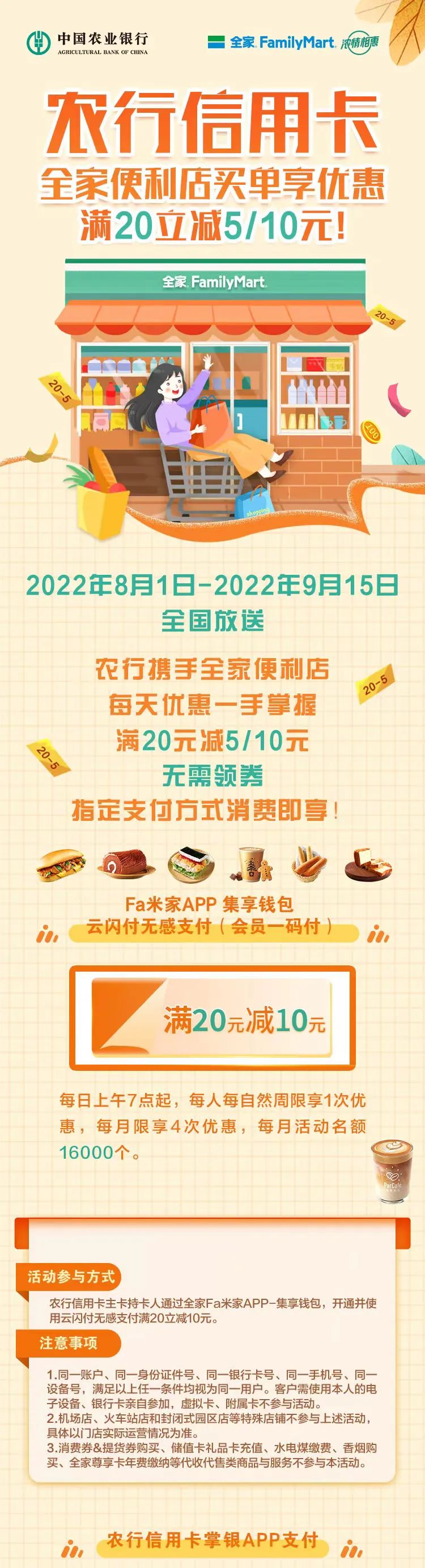 [商业]【农行浓情相惠】全家便利店满20立减5-10元!无需领券,支付立享! [复制链接]